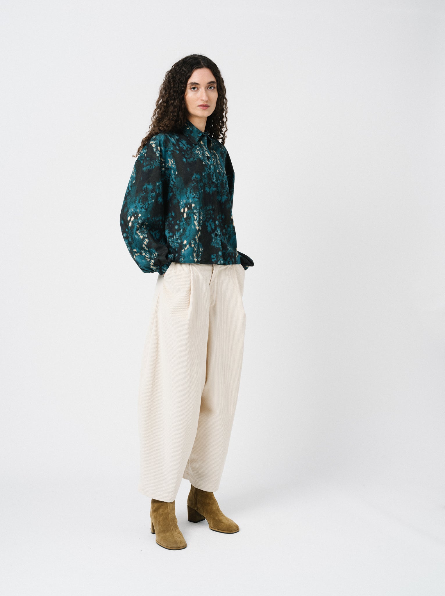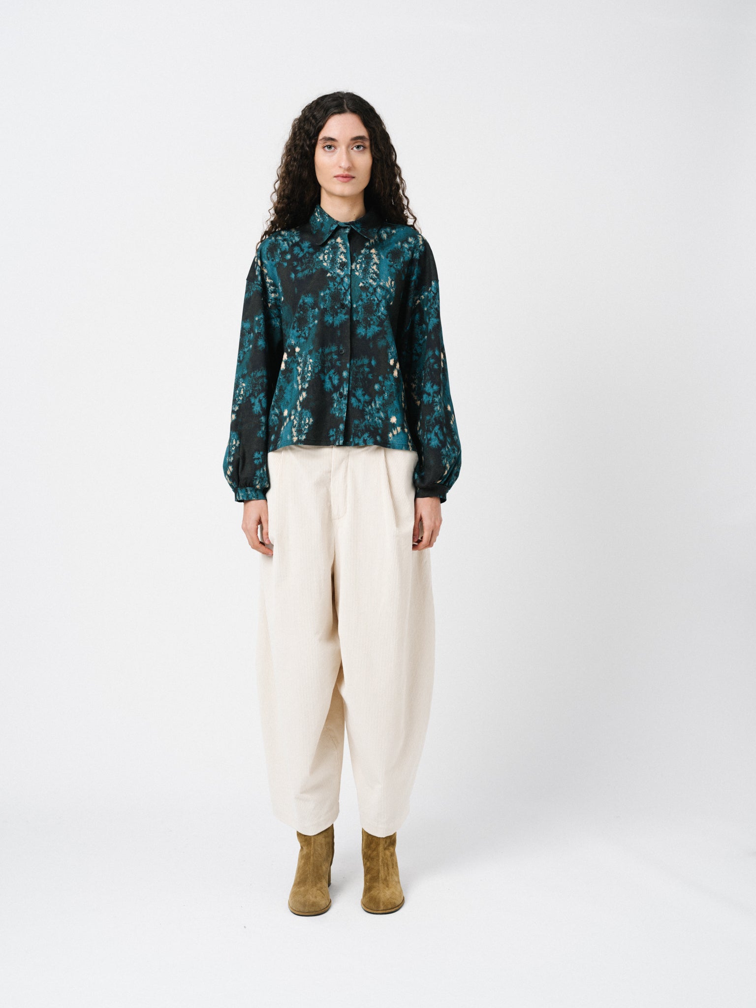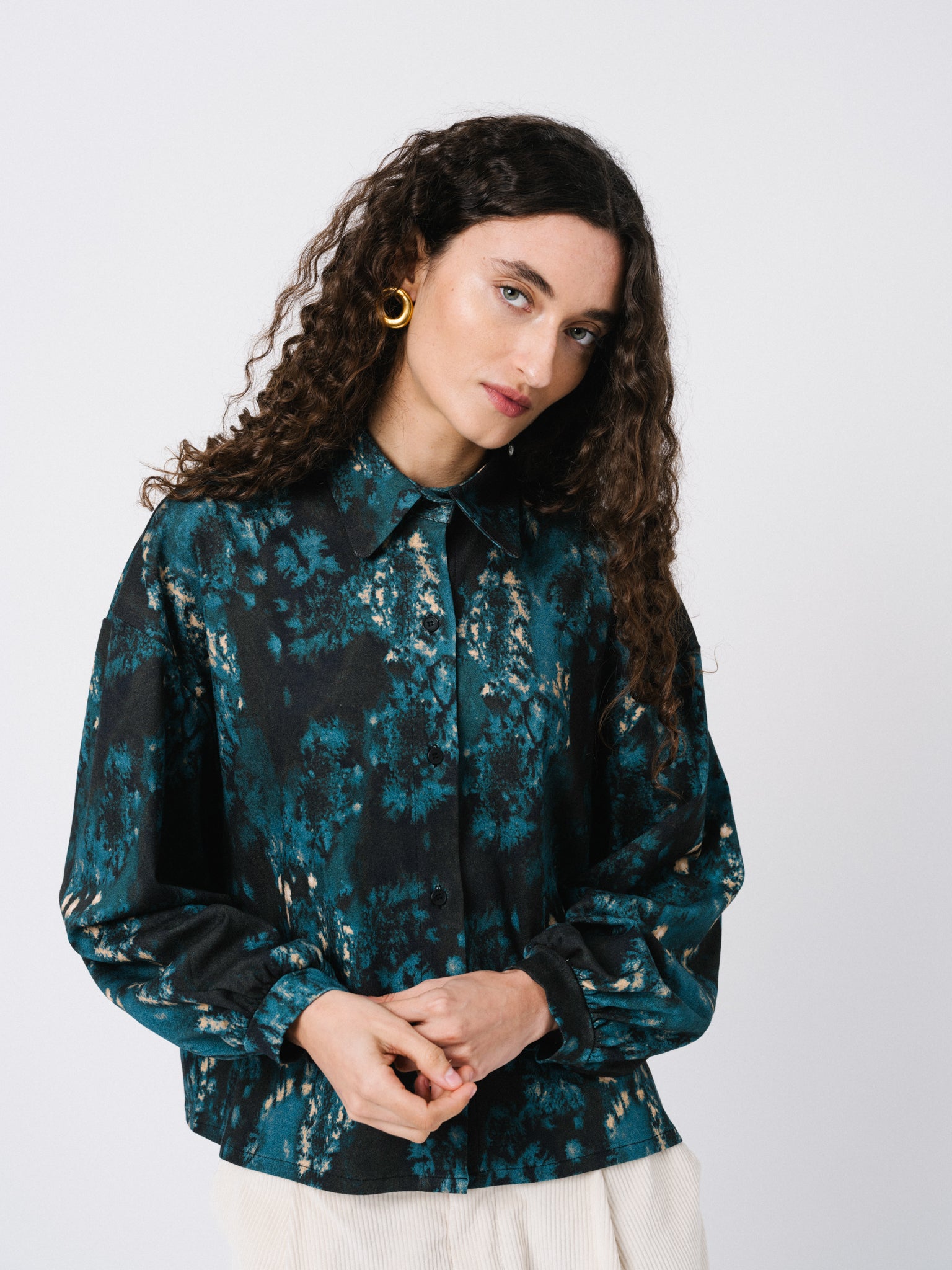 Camisa de manga larga con cierre delantero con botonadura. Manga ligeramente abullonada rematada en puño. Cuello camiselo. Estampado propio diseñado en nuestro estudio.