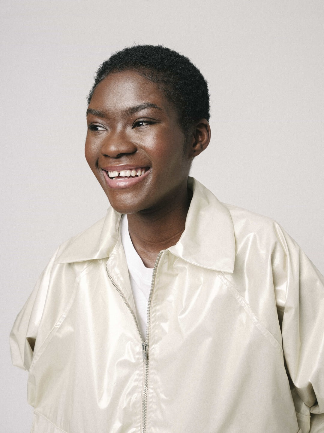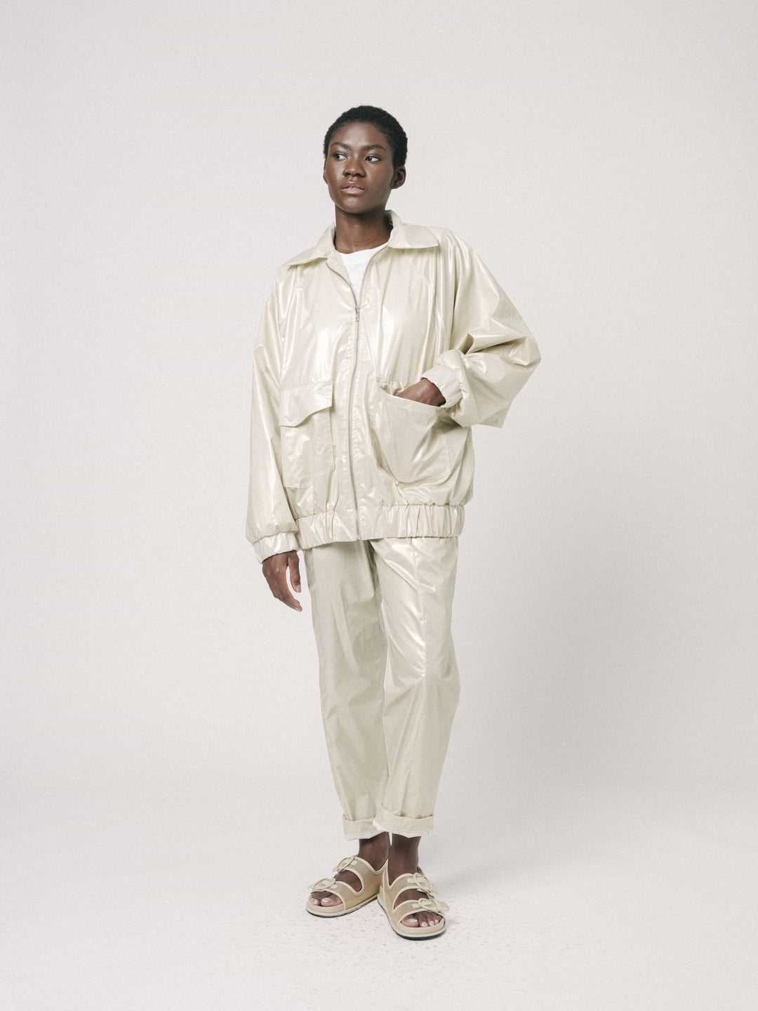 La clásica Bomber reinventada, con cuello camisero y con goma fruncida a la cadera para mayor comodidad. Prenda ligeramente oversize con manga raglán y bolsillos sobre en el delantero.
