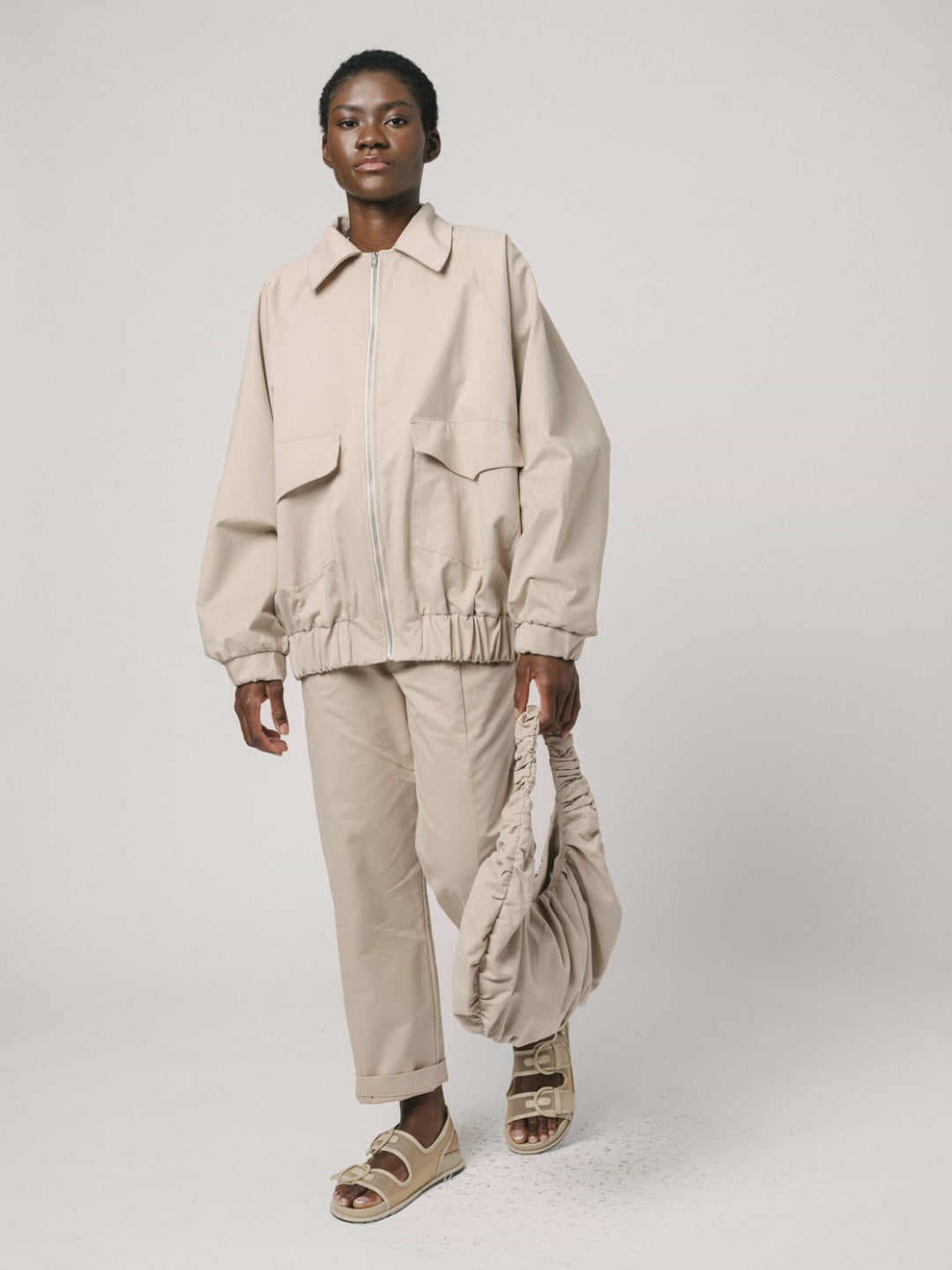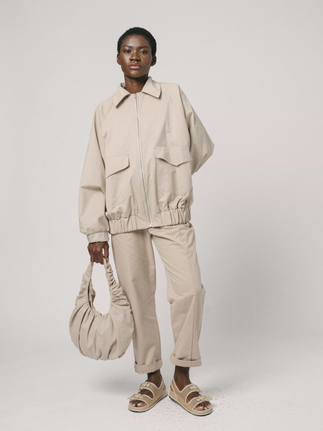 La clásica Bomber reinventada, con cuello camisero y con goma fruncida a la cadera para mayor comodidad. Prenda ligeramente oversize con manga raglán y bolsillos sobre en el delantero.