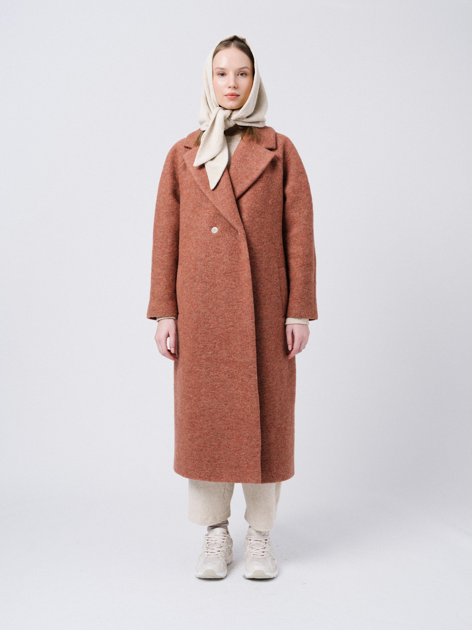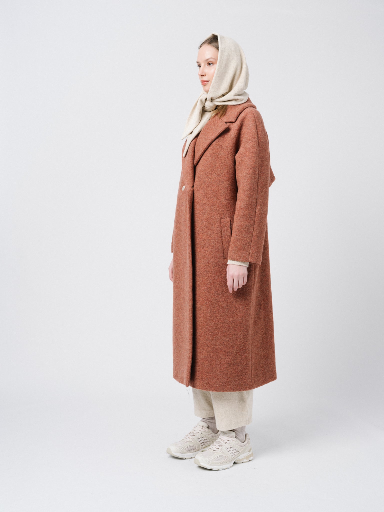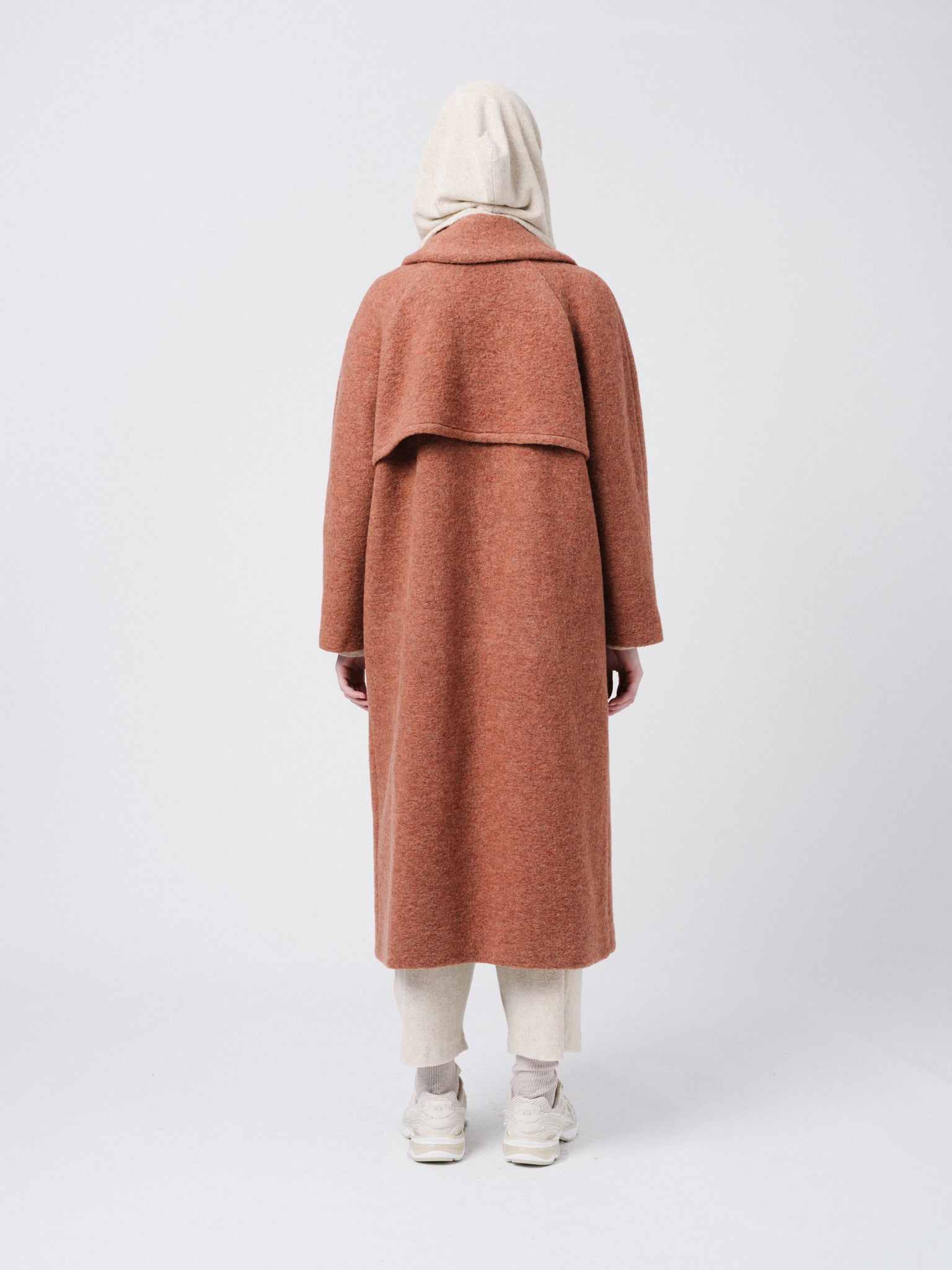 Abrigo oversize largo y recto con detalle de capa. Botonadura de cierre.