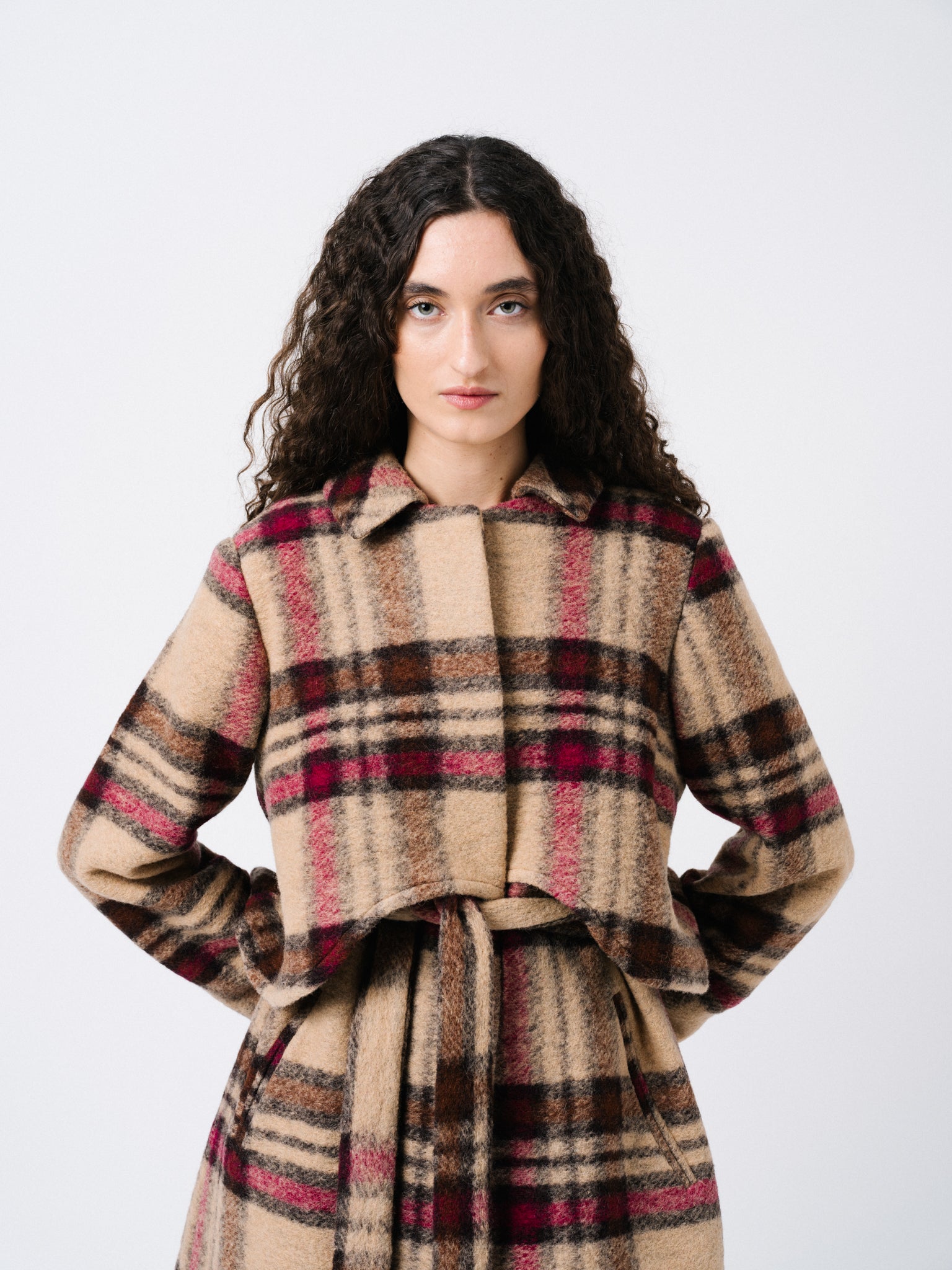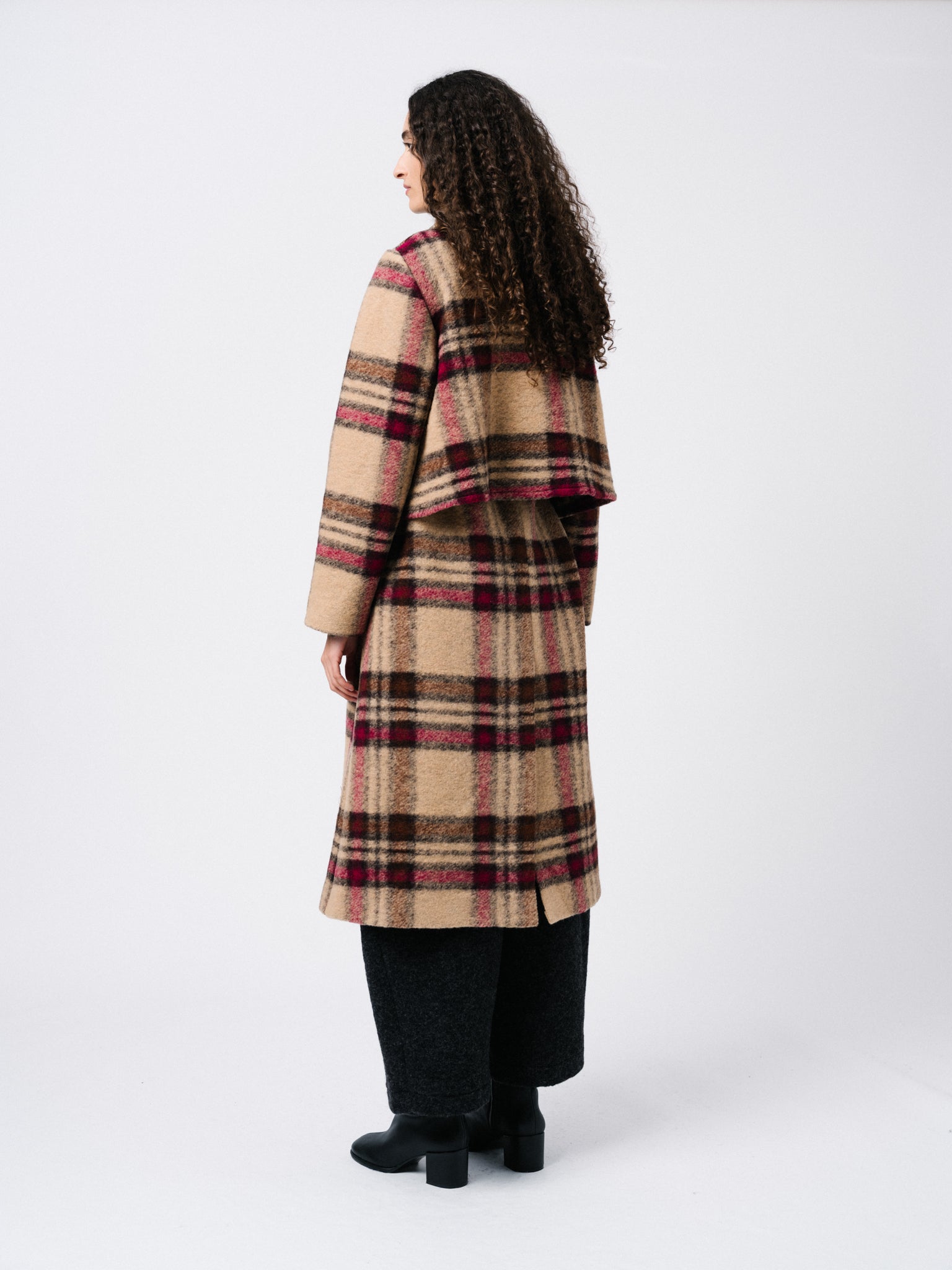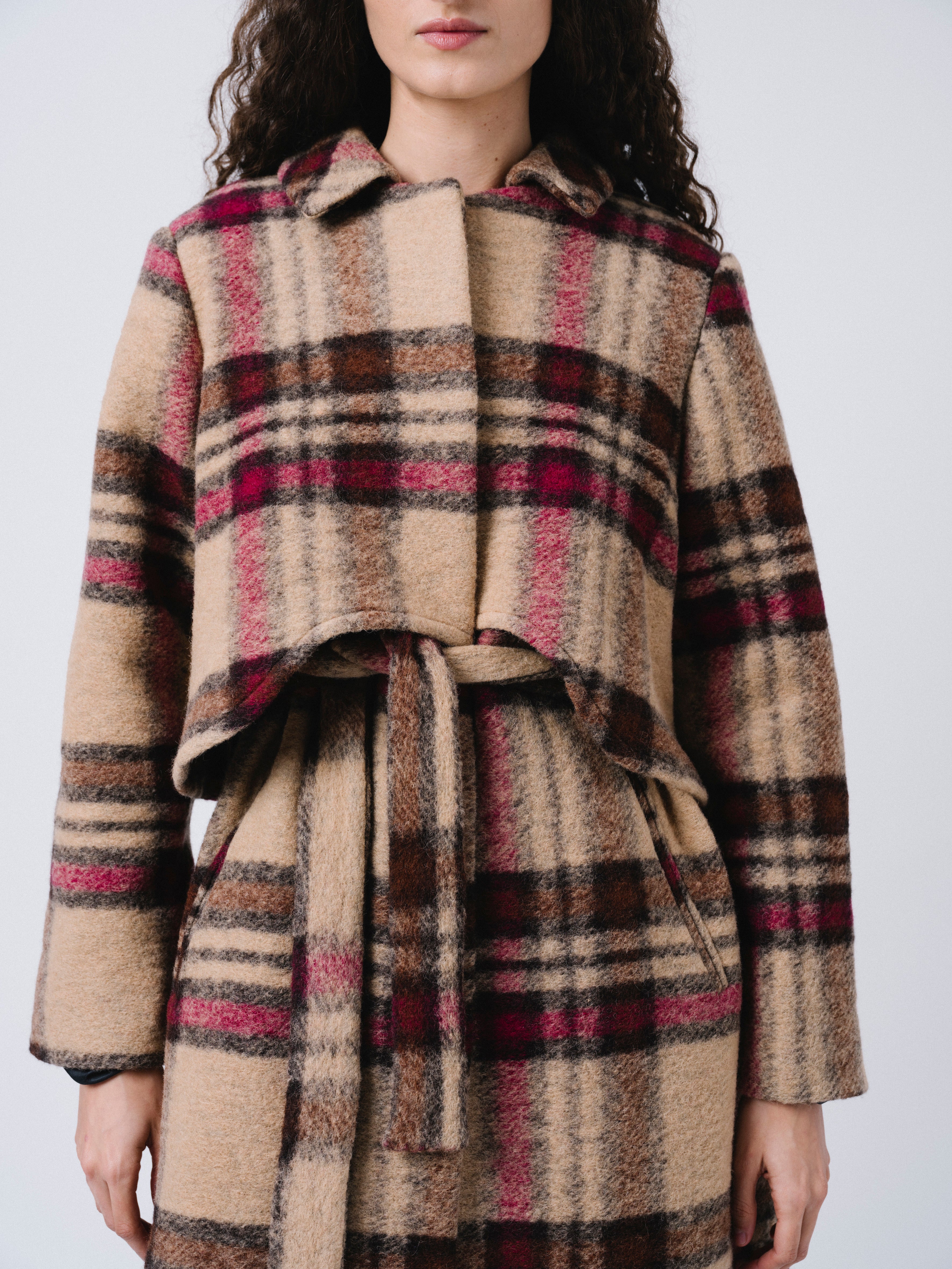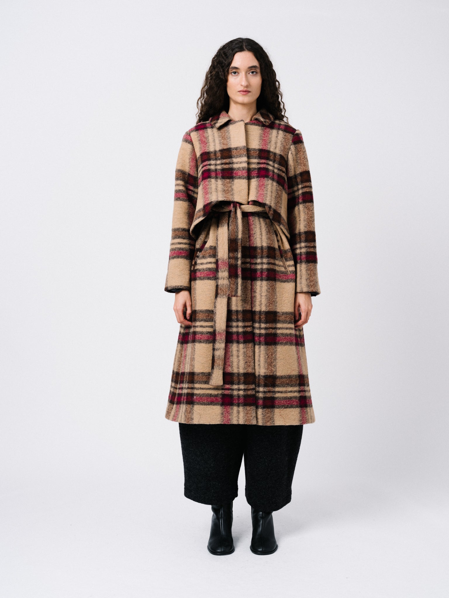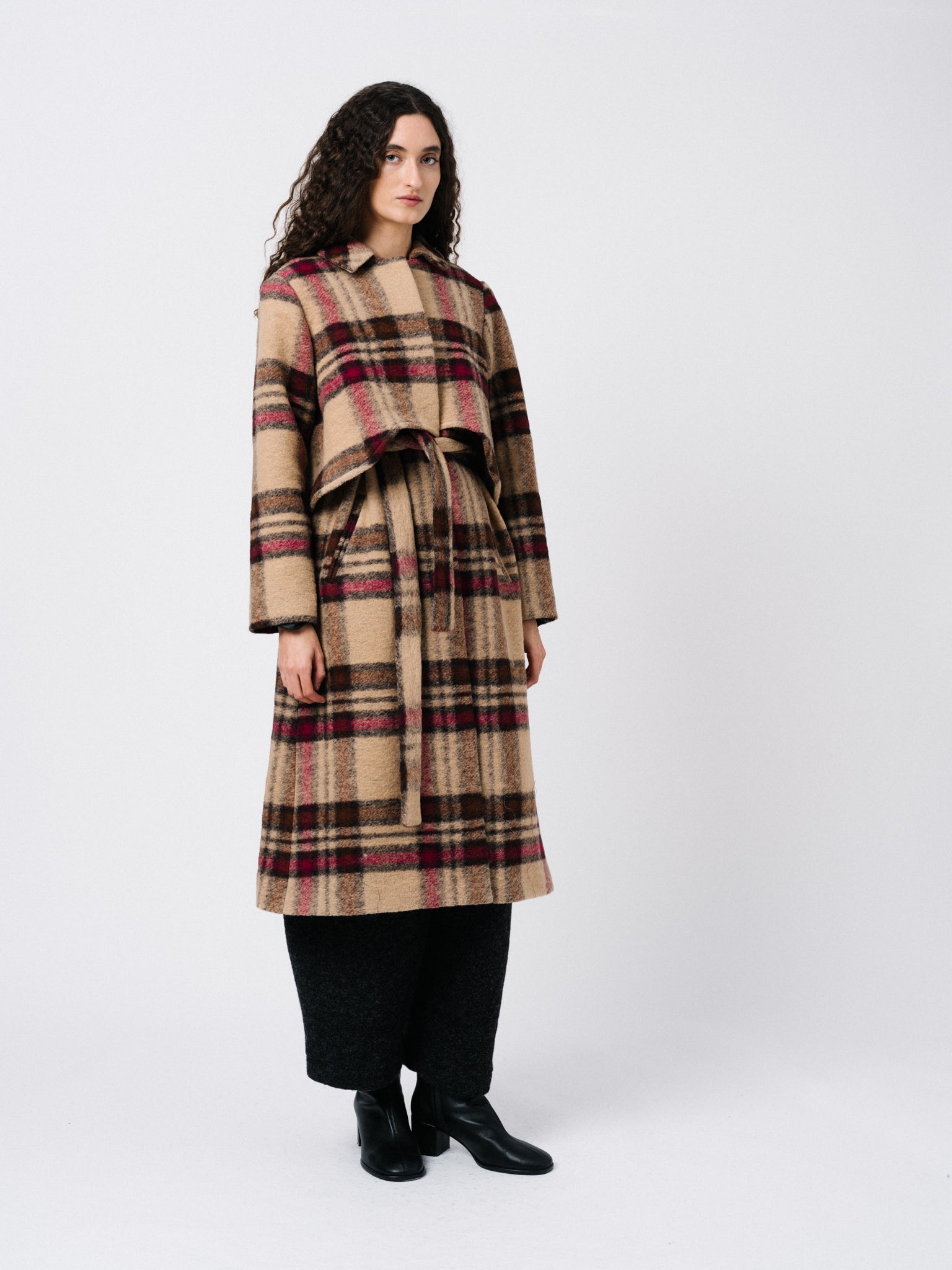 Abrigo largo recto encajado en el cuerpo. Detalle de capa en el delantero y espalda. Opción de ajustarlo con cinturón