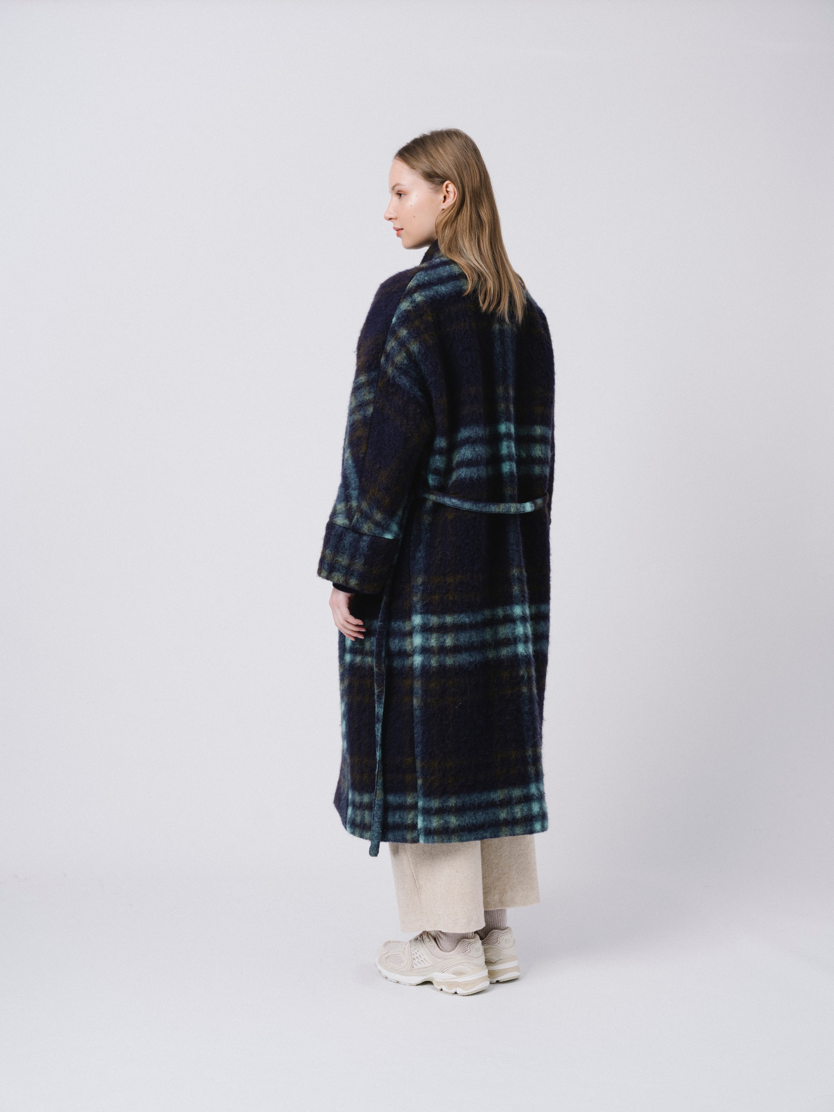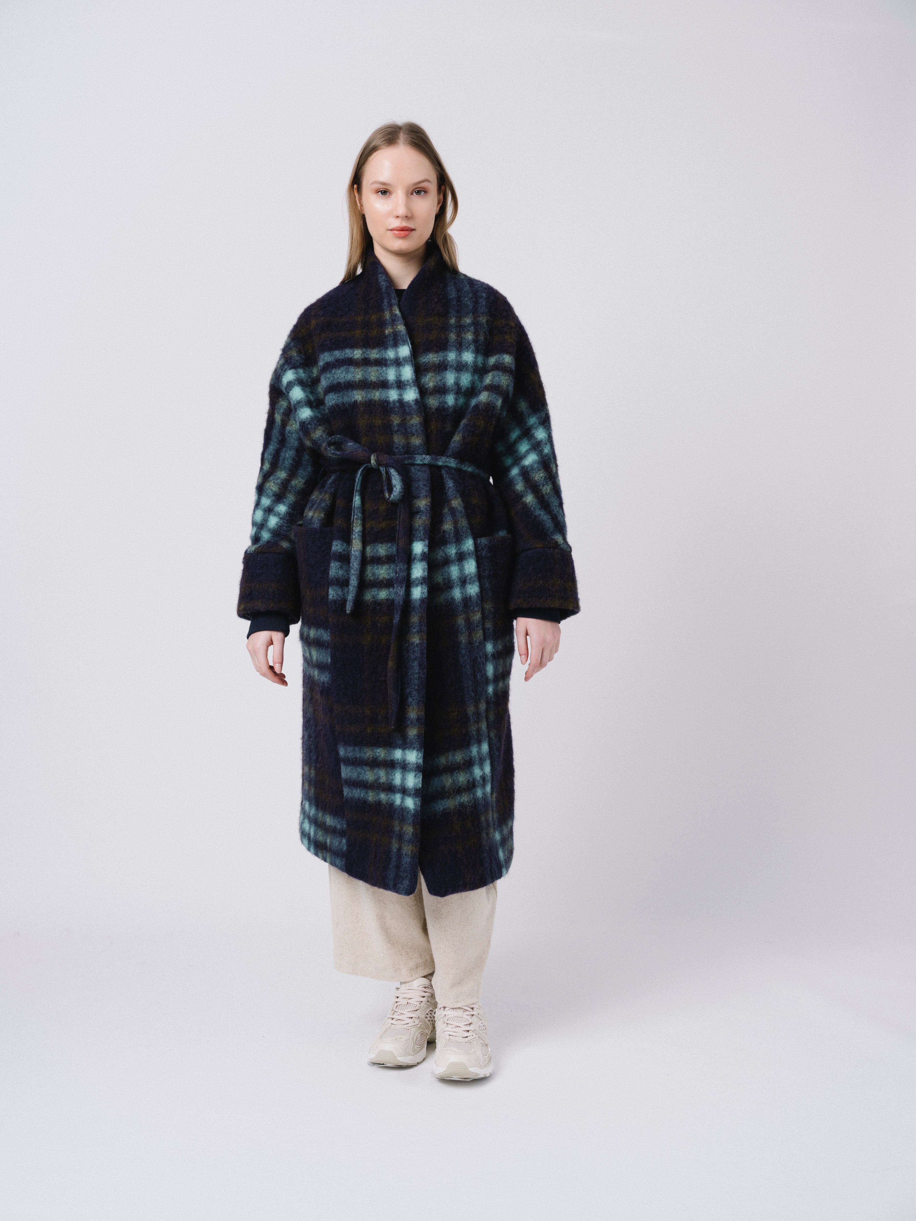 Abrigo oversize largo con cuello elevado. Opción de ajustarlo con cinturón. Bolsillos en delantero.
