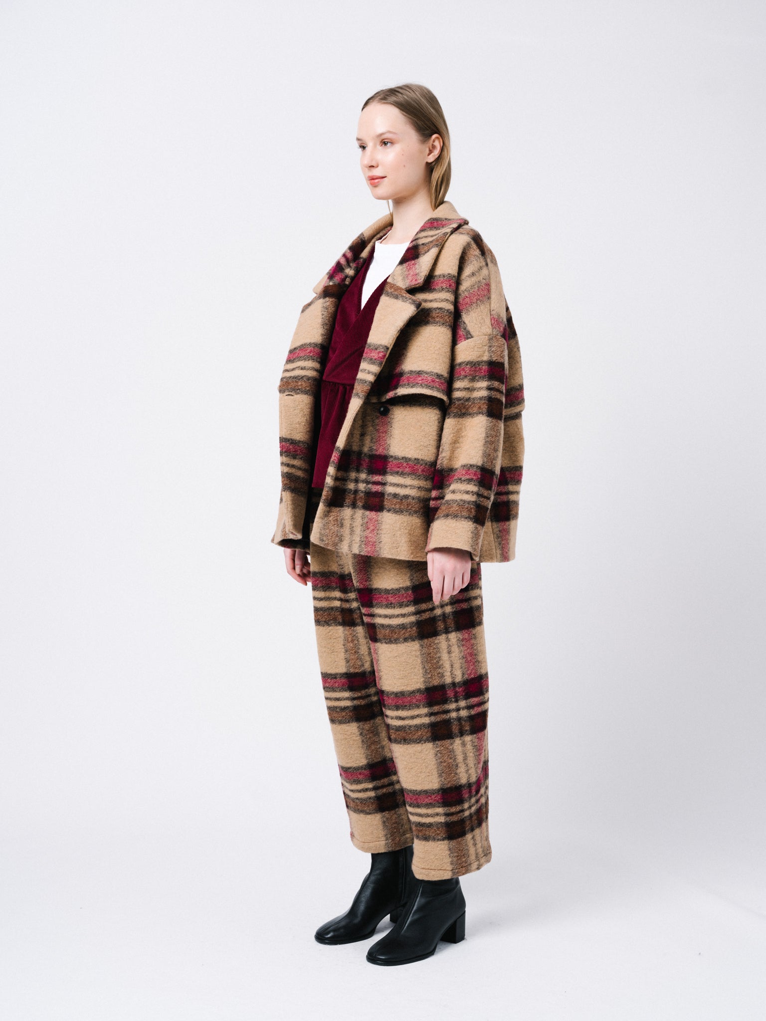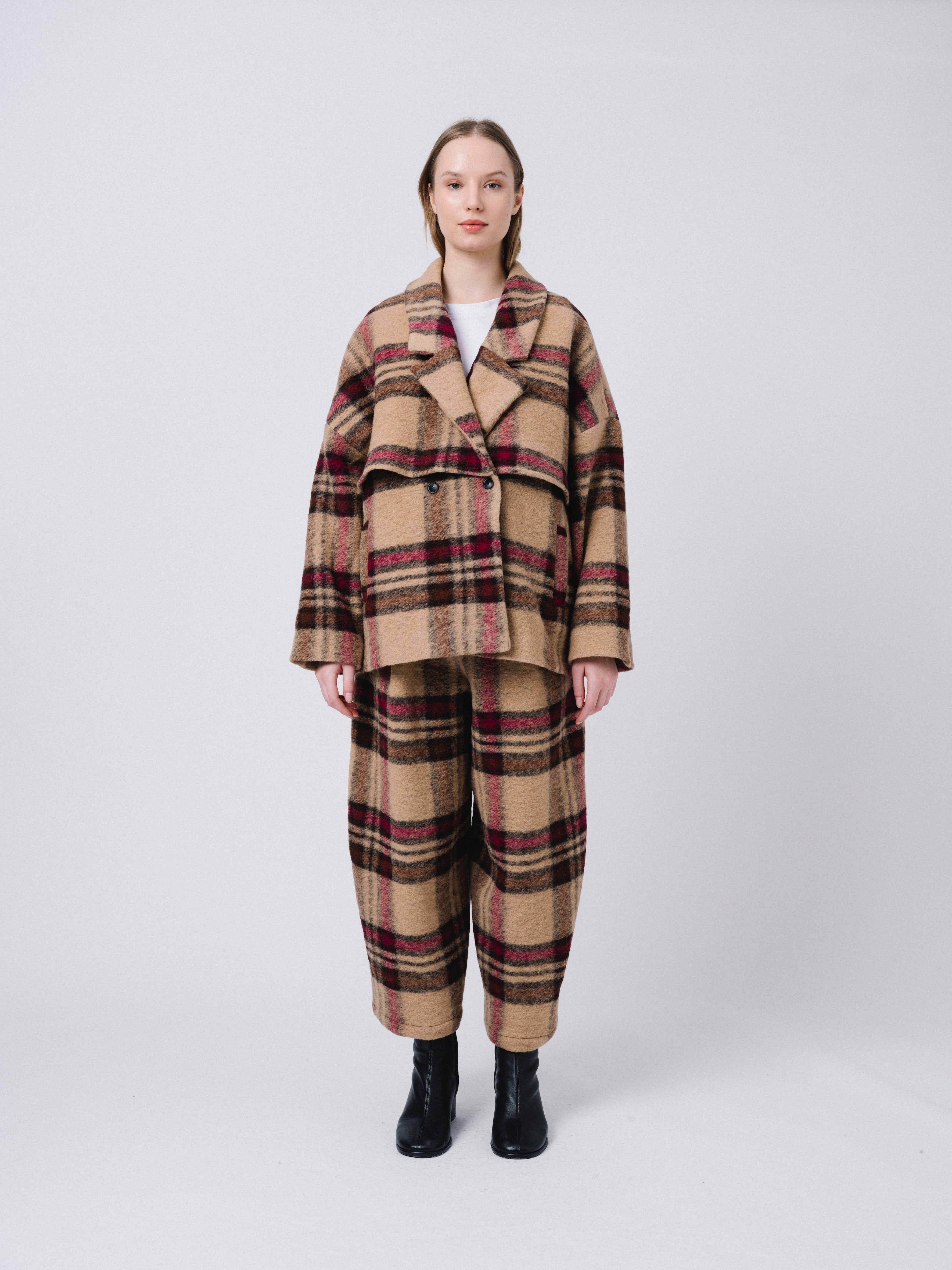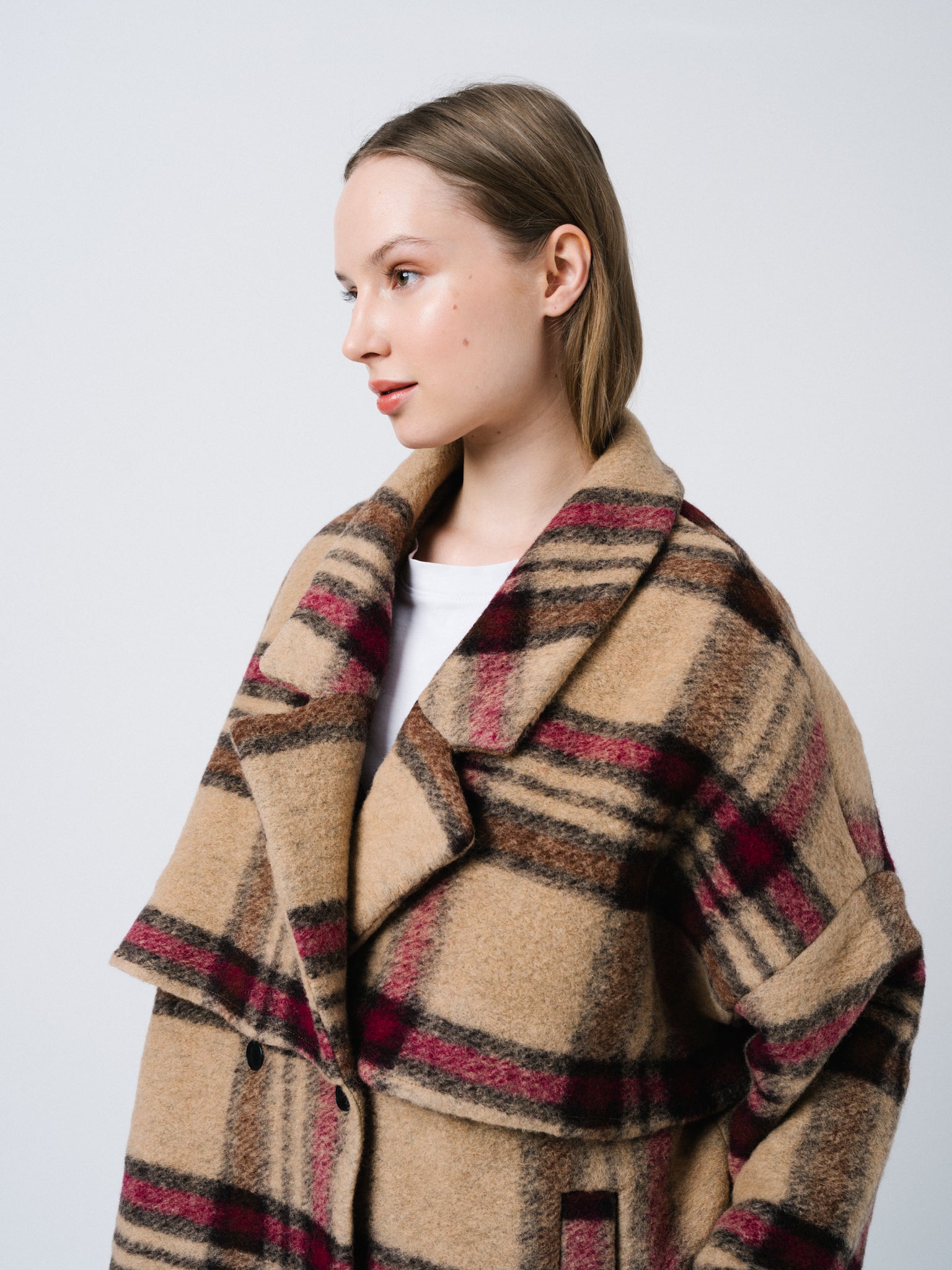 Abrigo oversize corto con detalle de capa. Bosillos de ojal y cierre en cruce con doble botonadura.