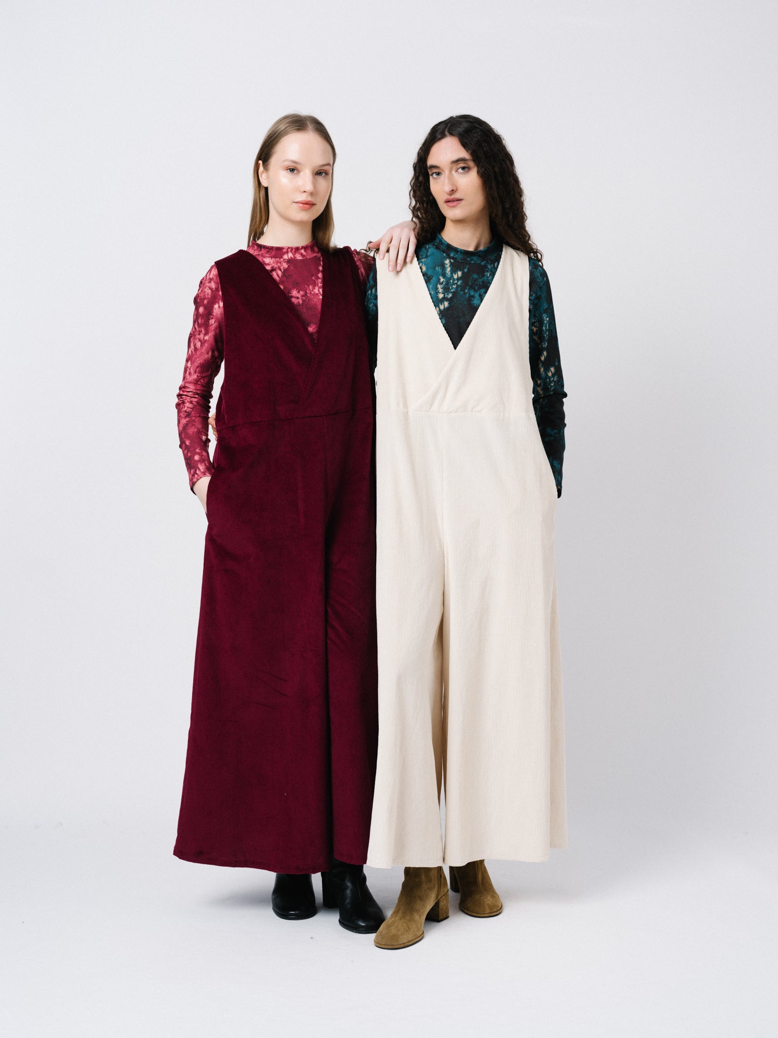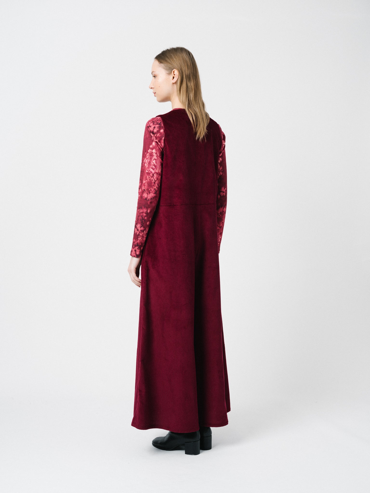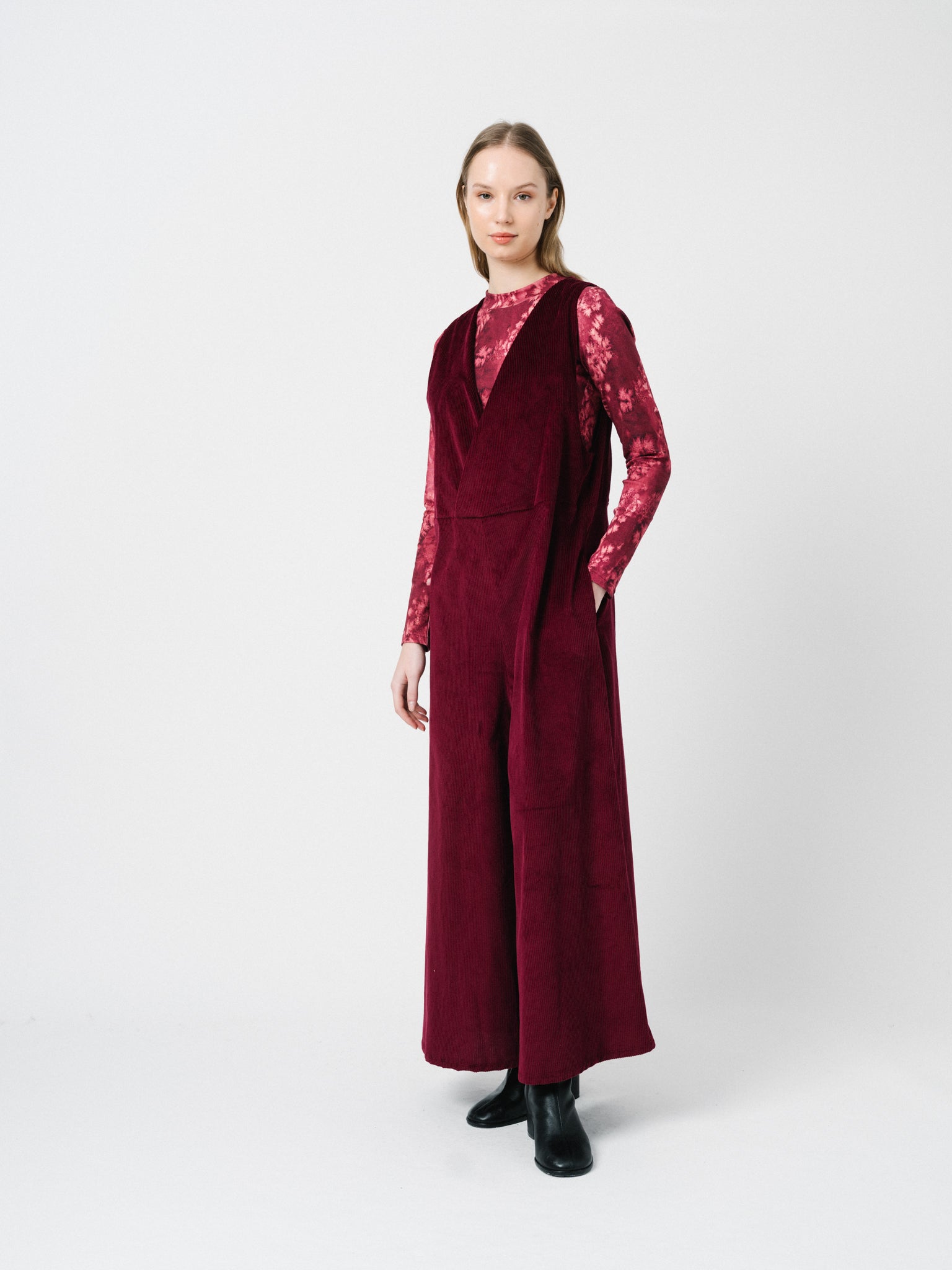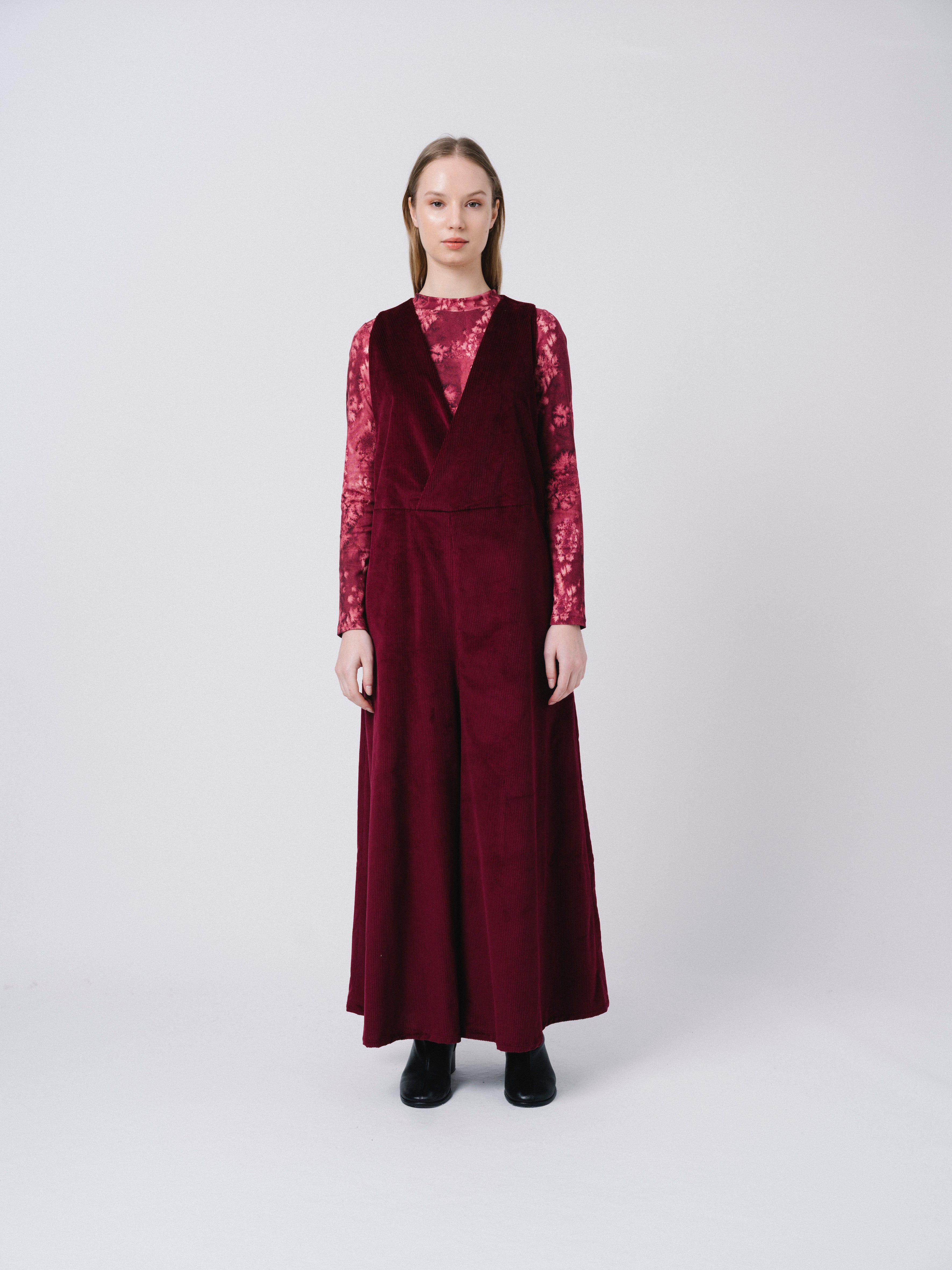 Mono largo de sisa con escote delantero en pico y pata ancha. Confeccionado en tejido de pana de algodón.