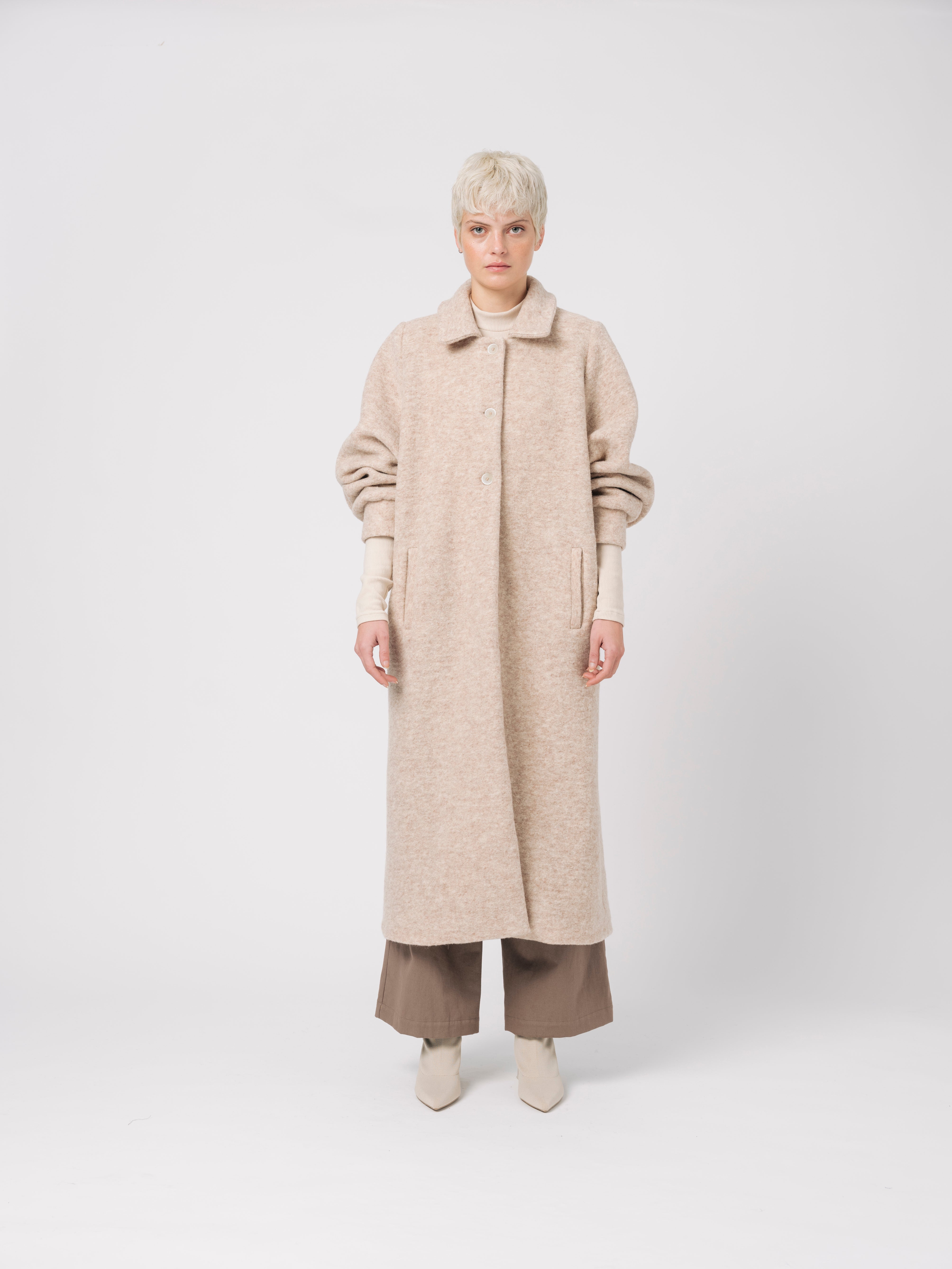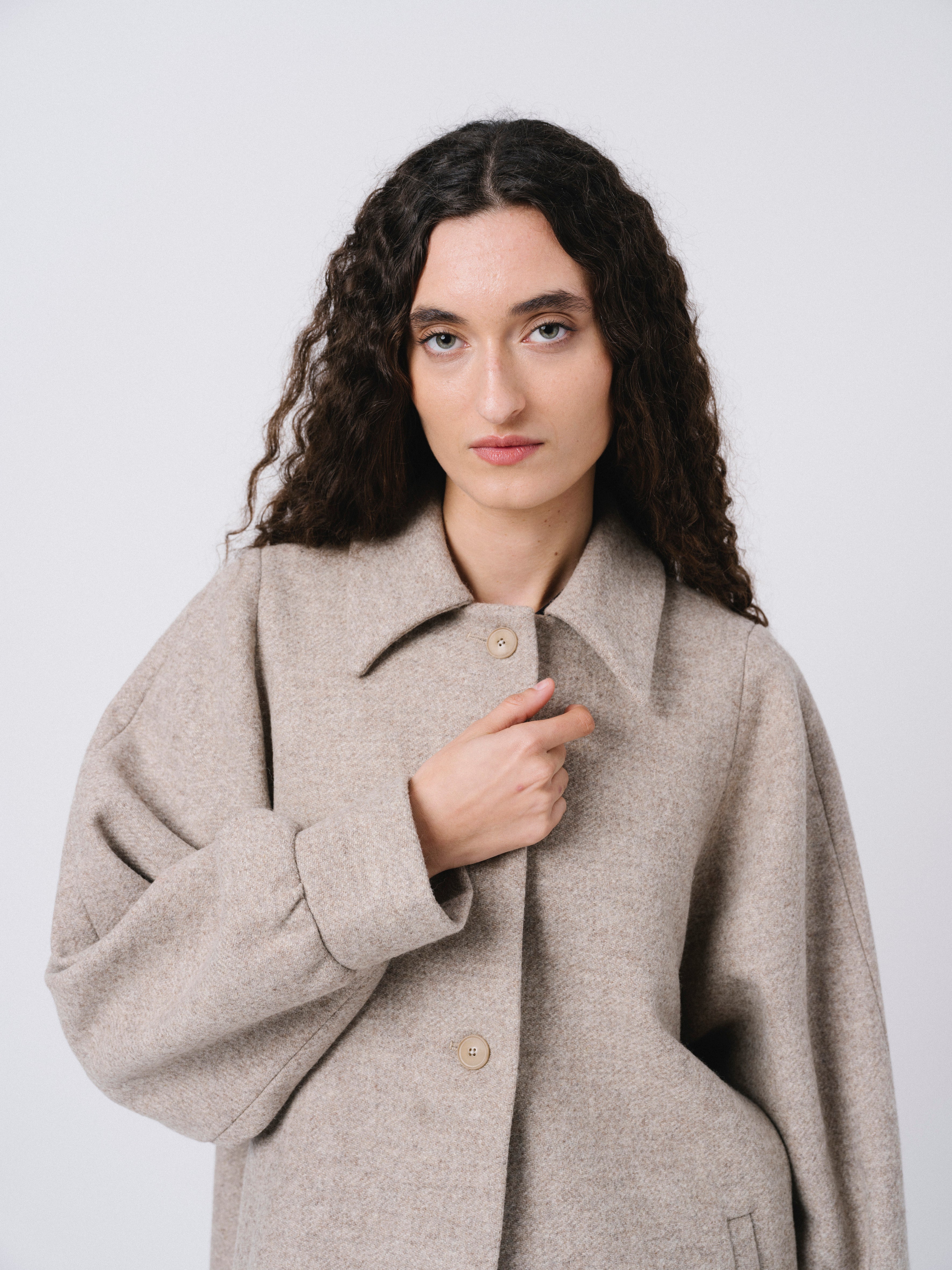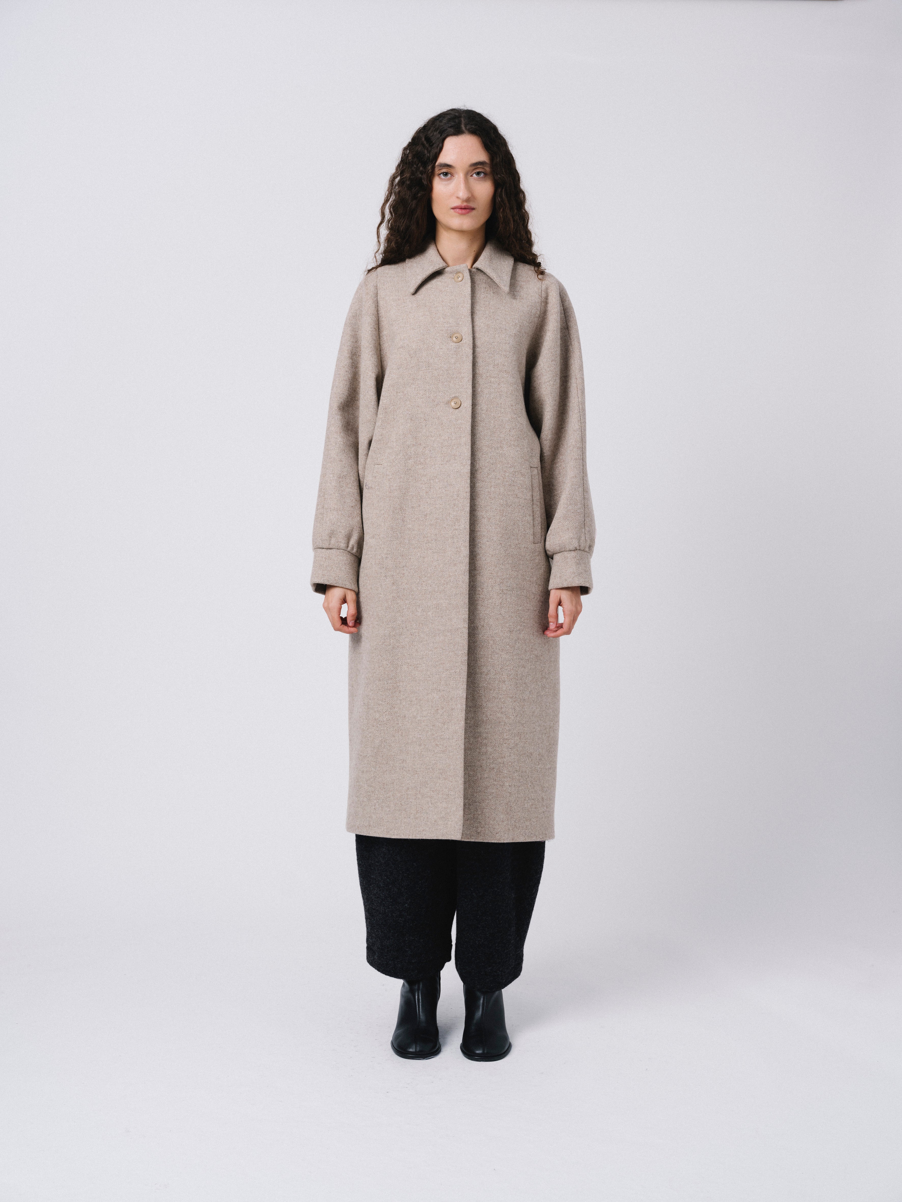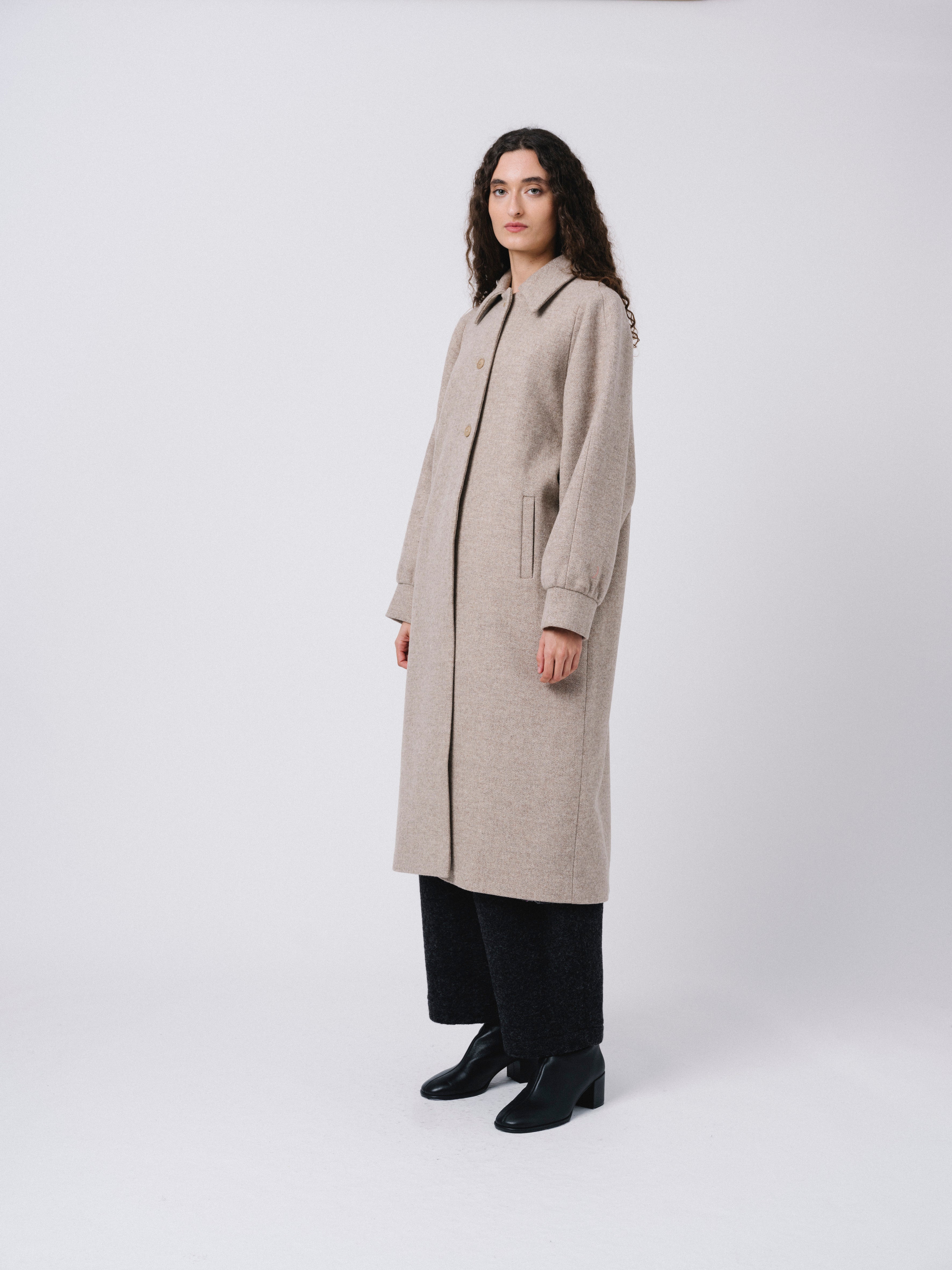 Abrigo oversize largo. Con cuello camisero y manga rematada con puño. Cierre con botonadura en el centro.