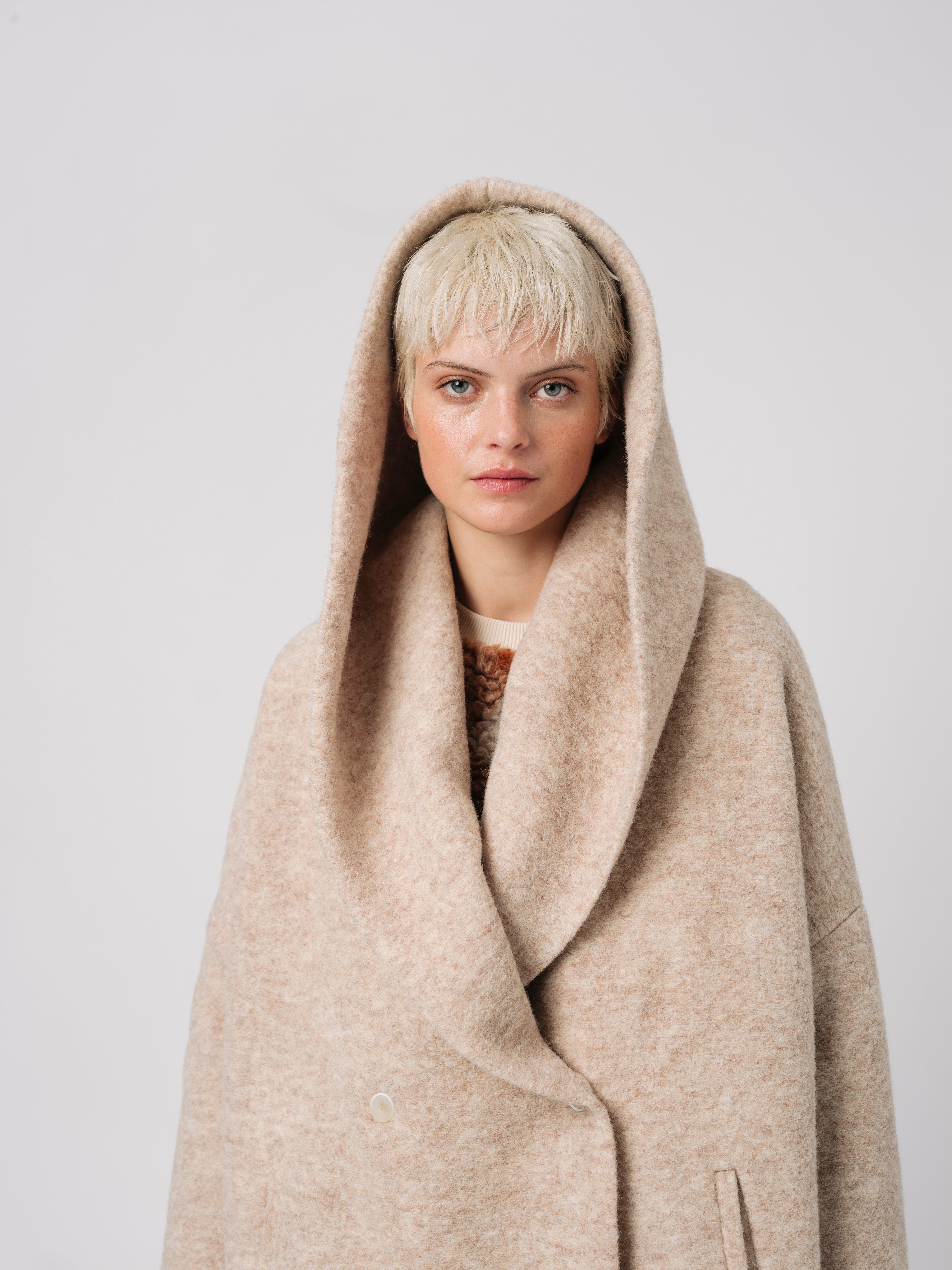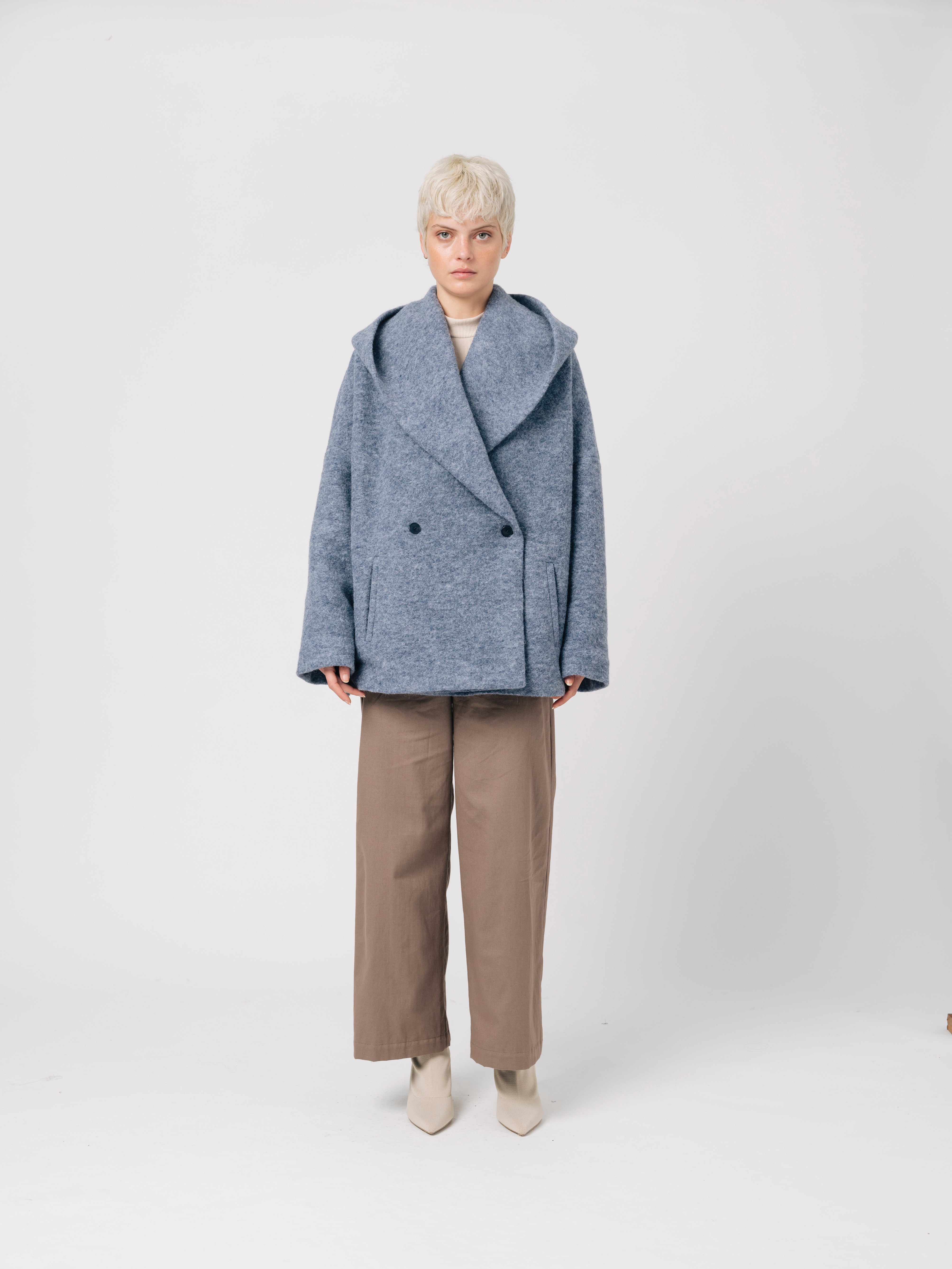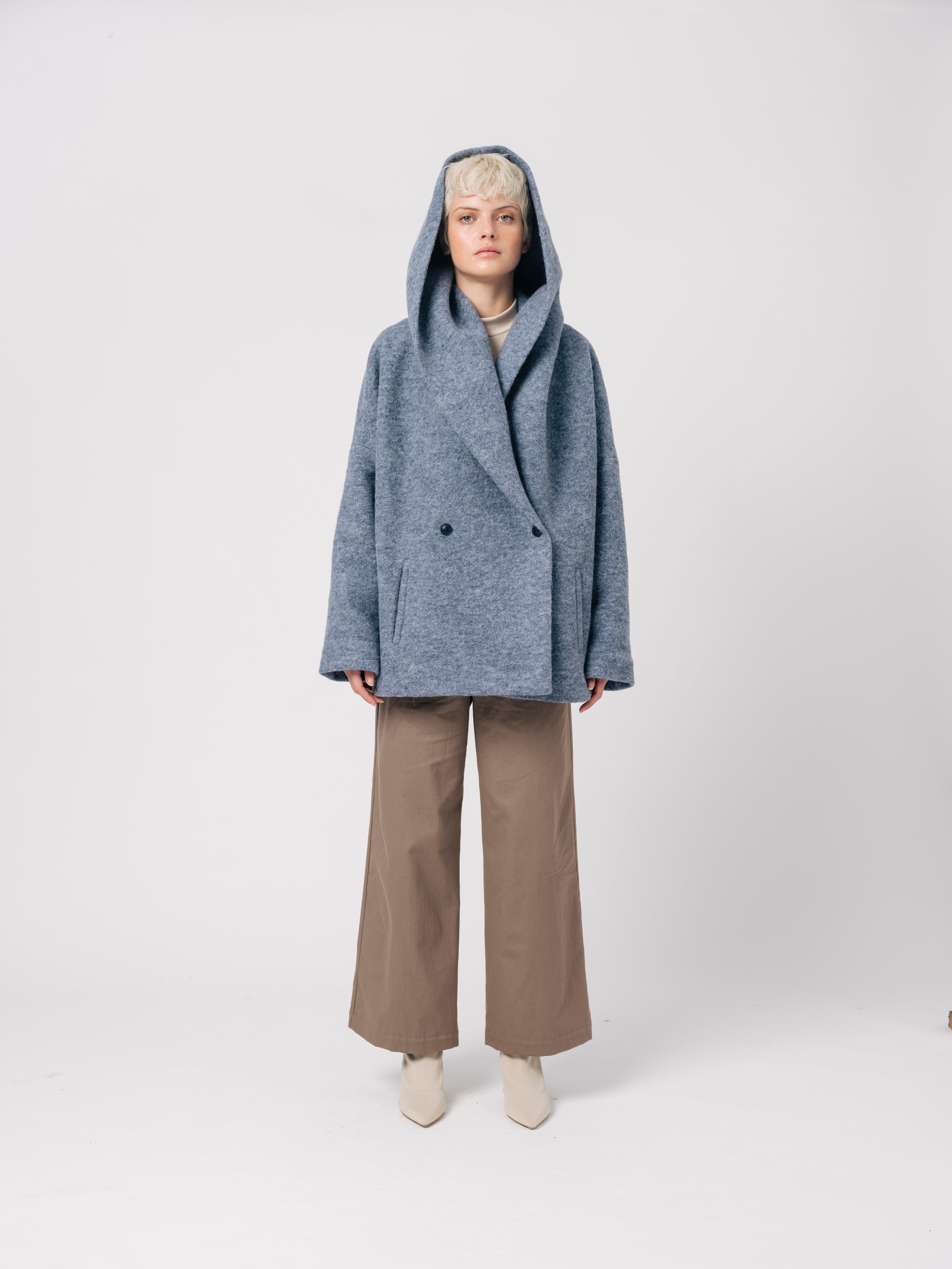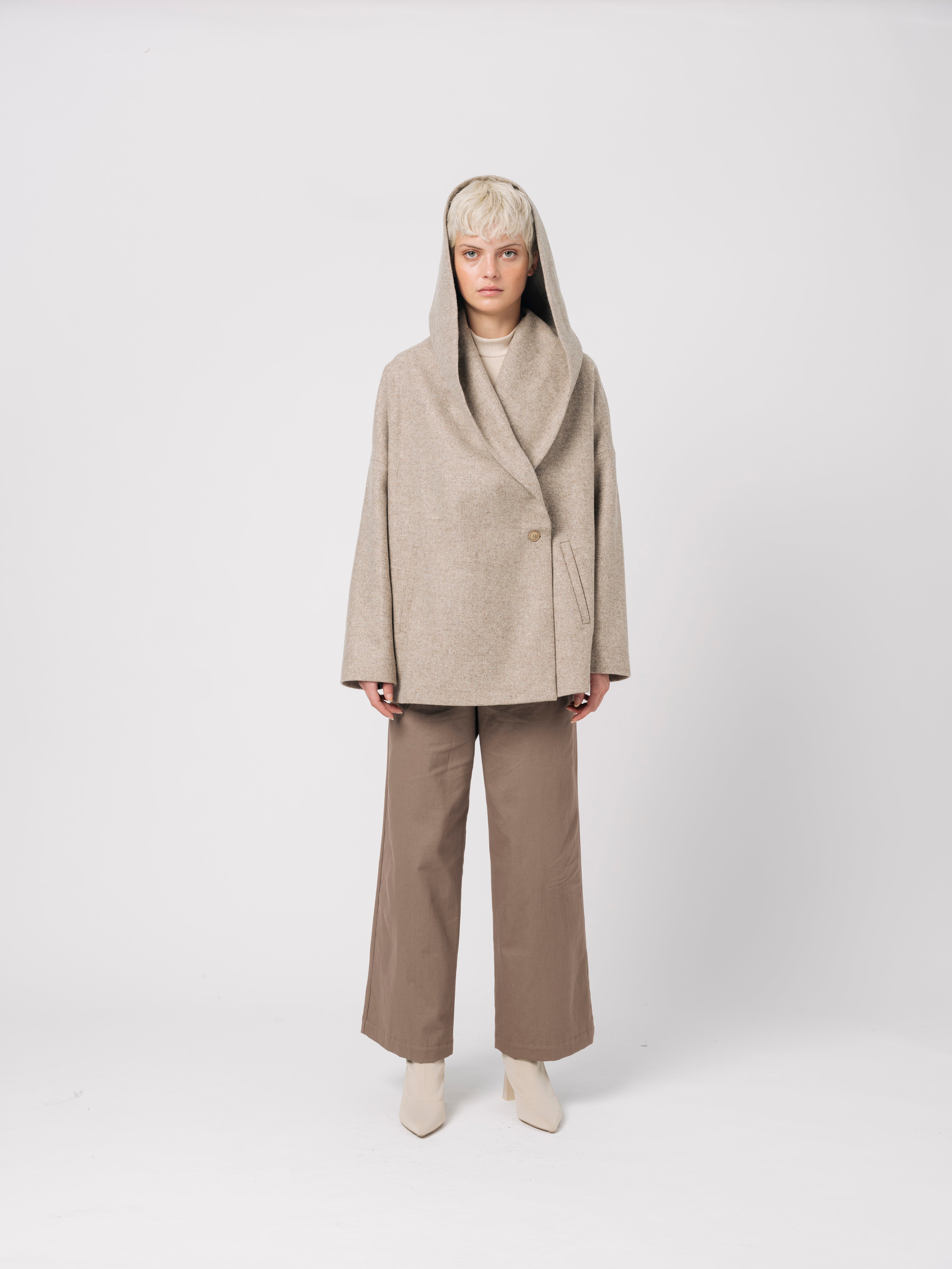 Abrigo oversize corto con capucha. Cierre con cruce.