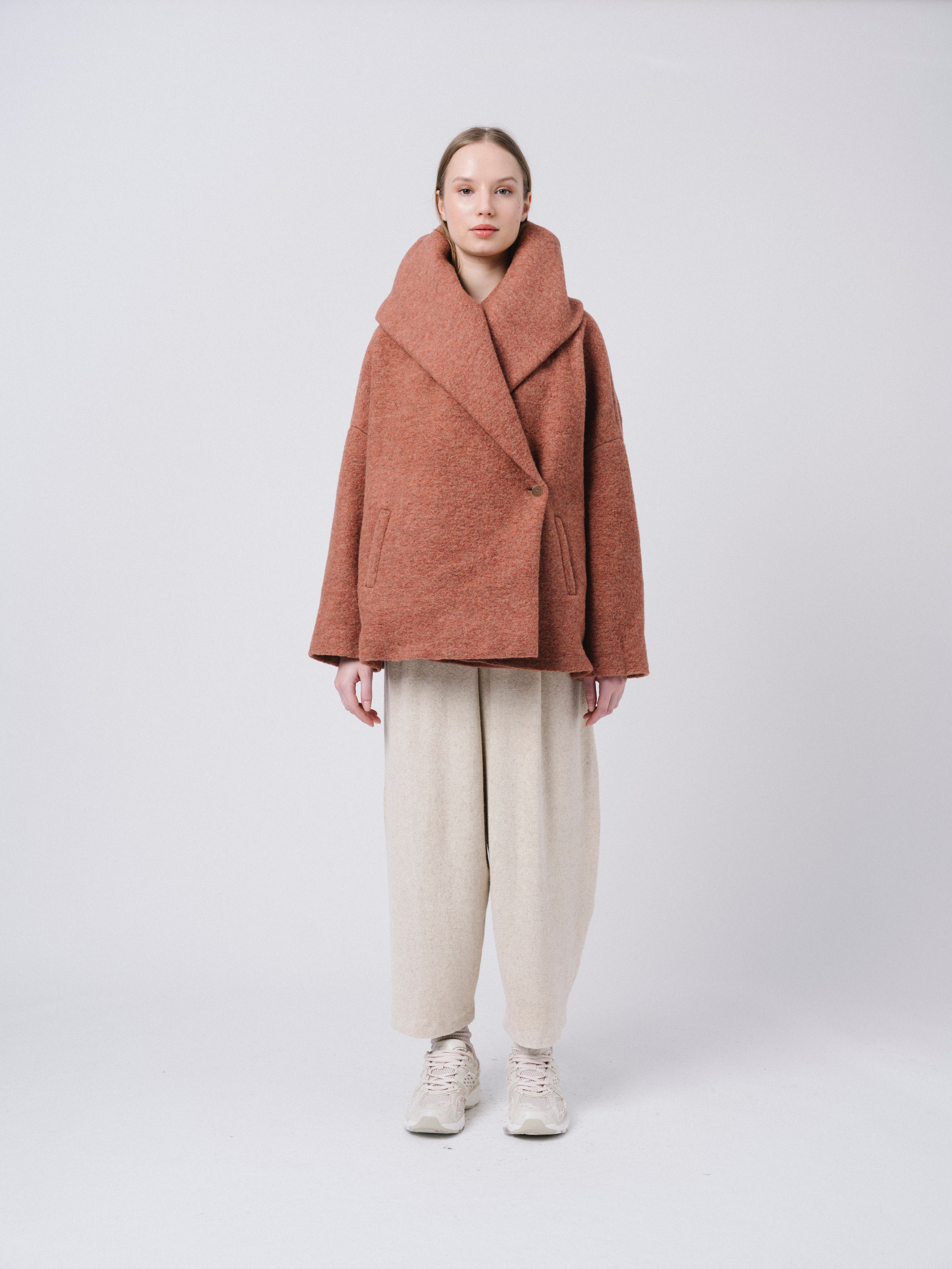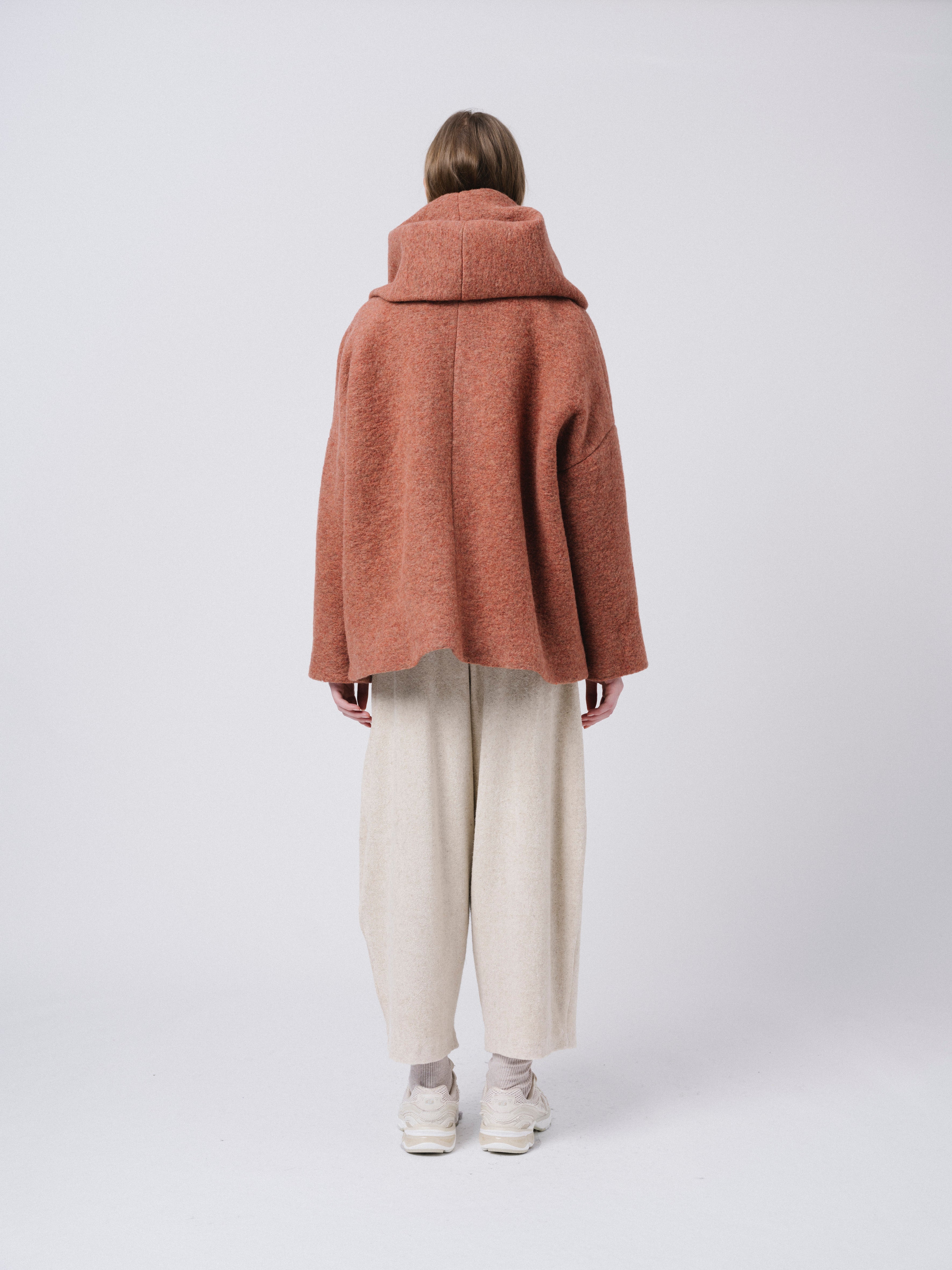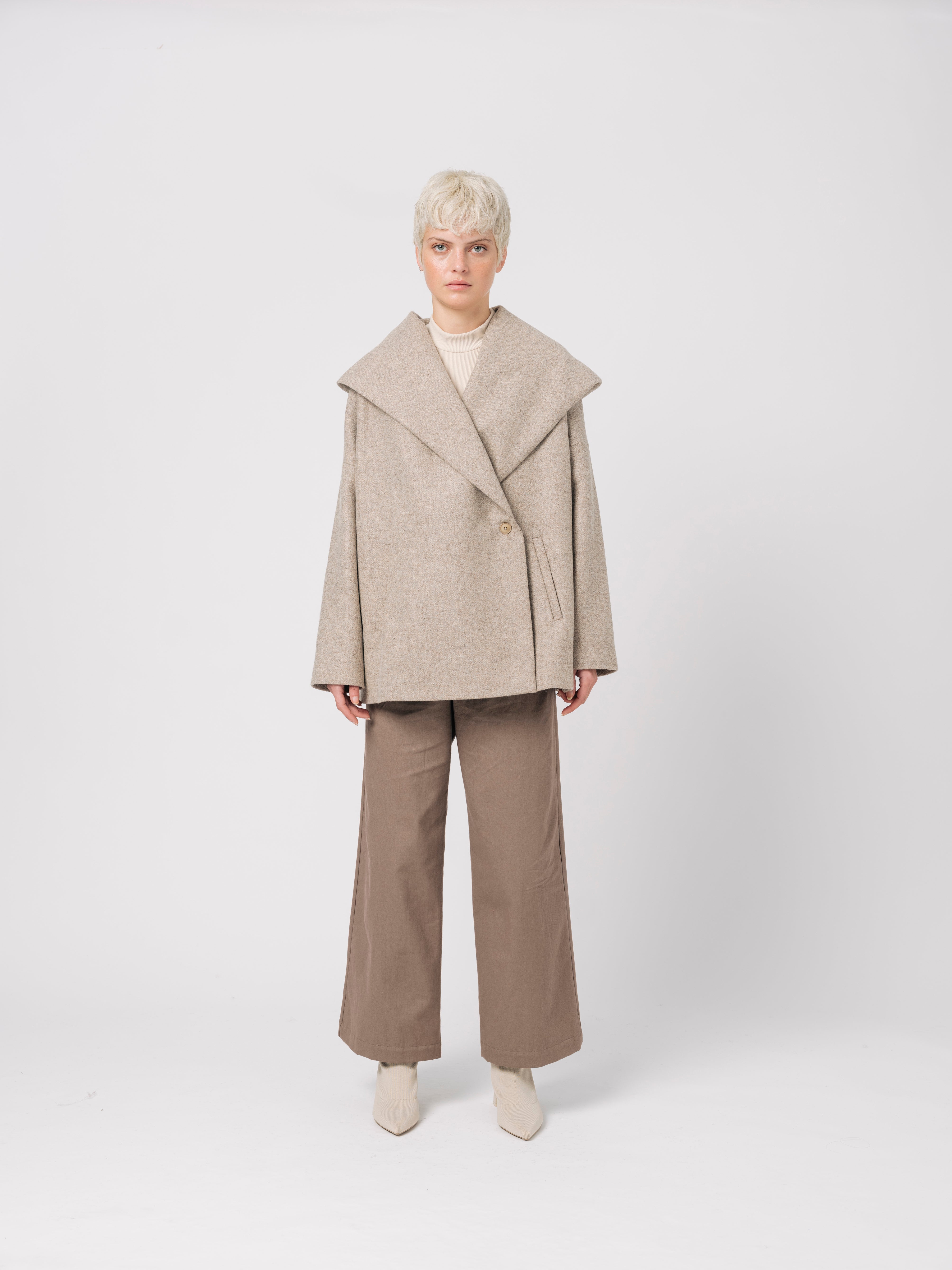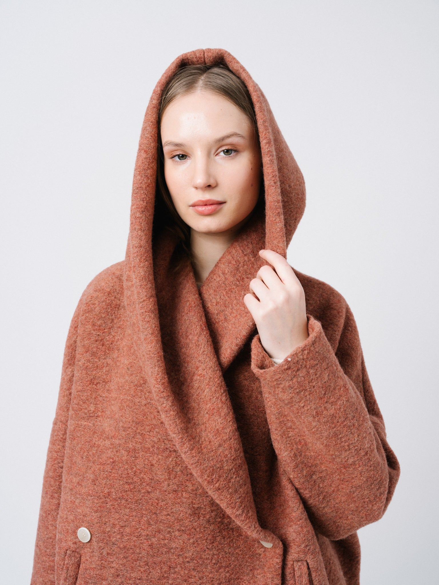 Abrigo oversize corto con capucha. Cierre con cruce.