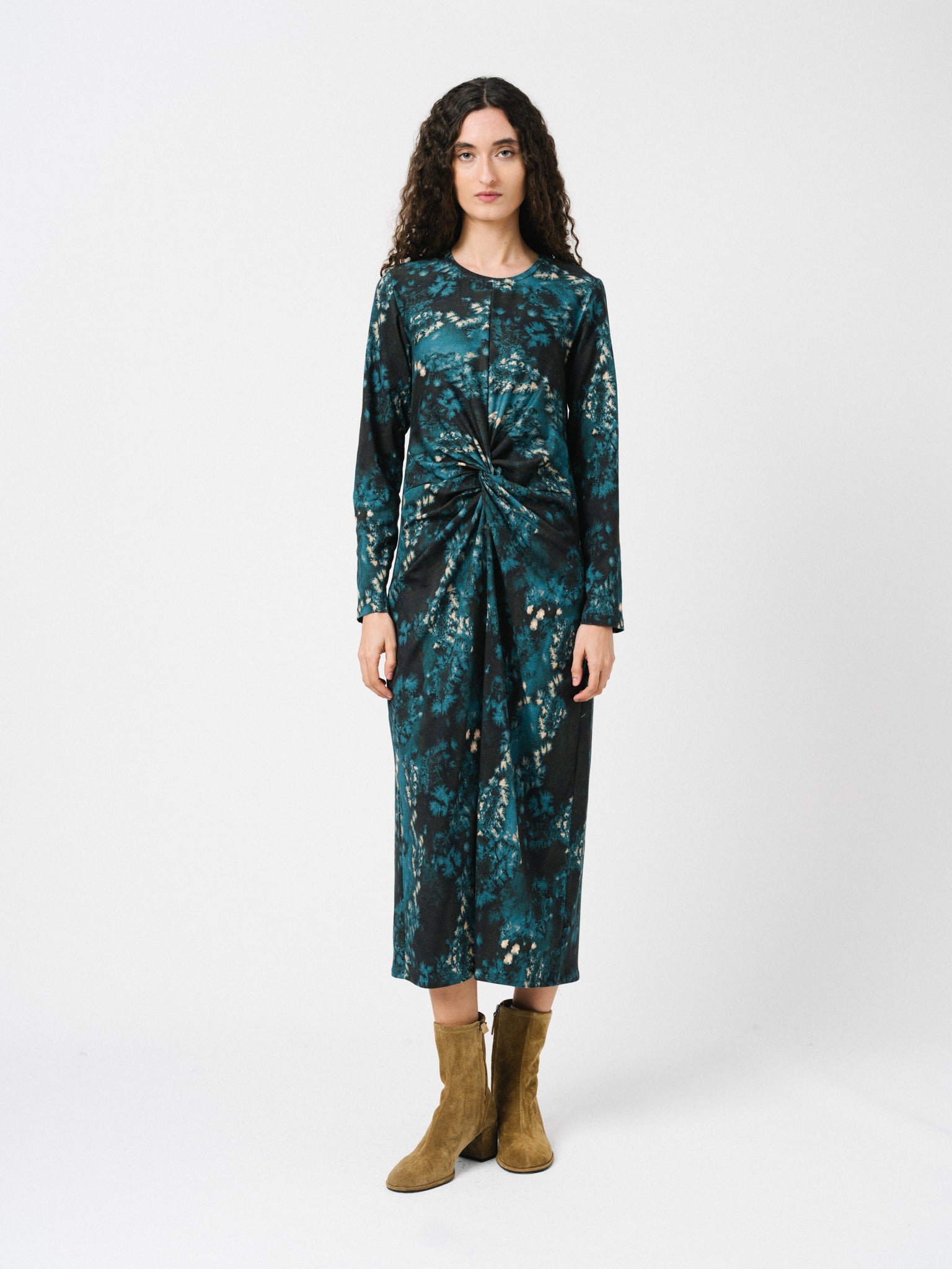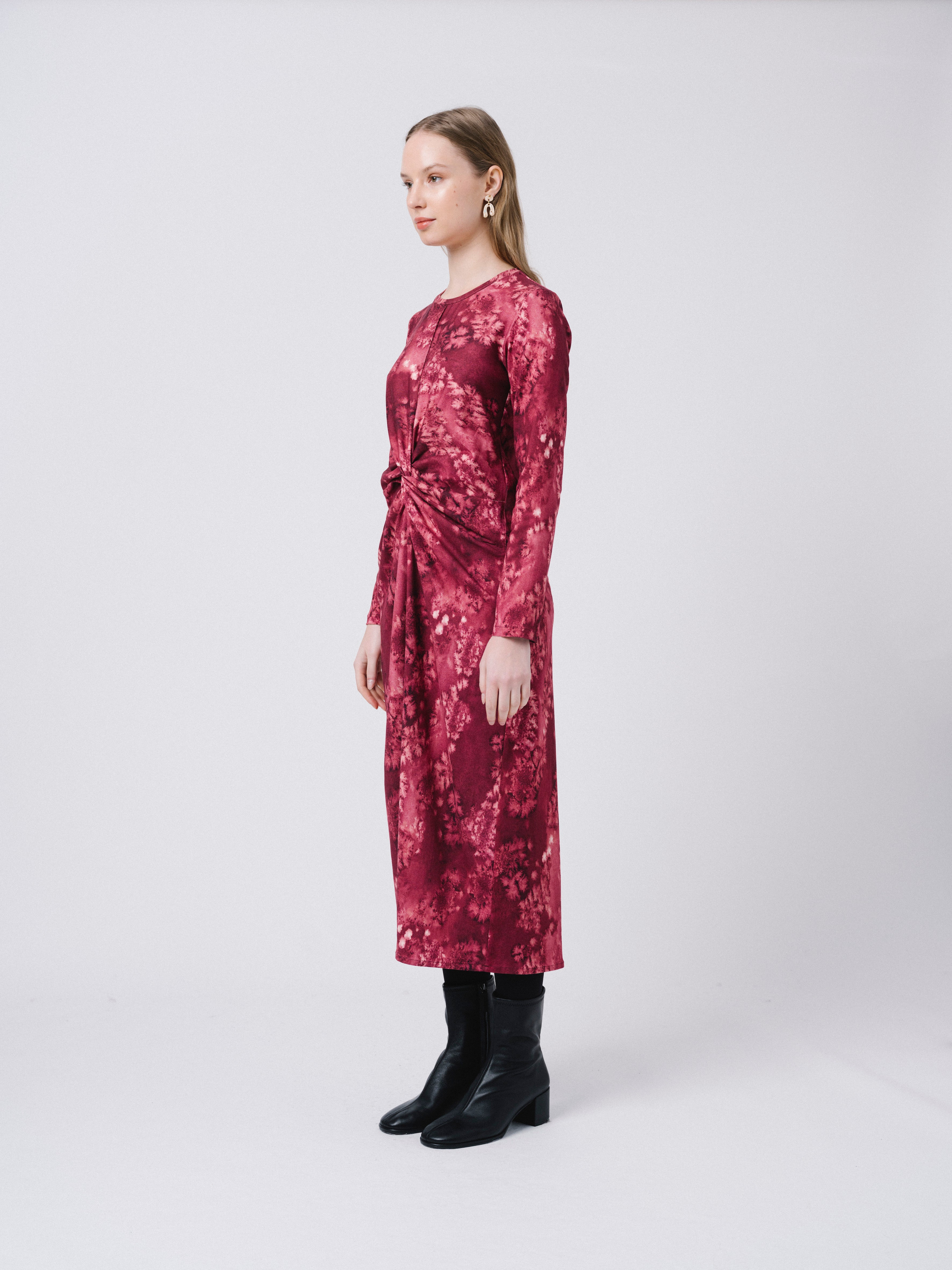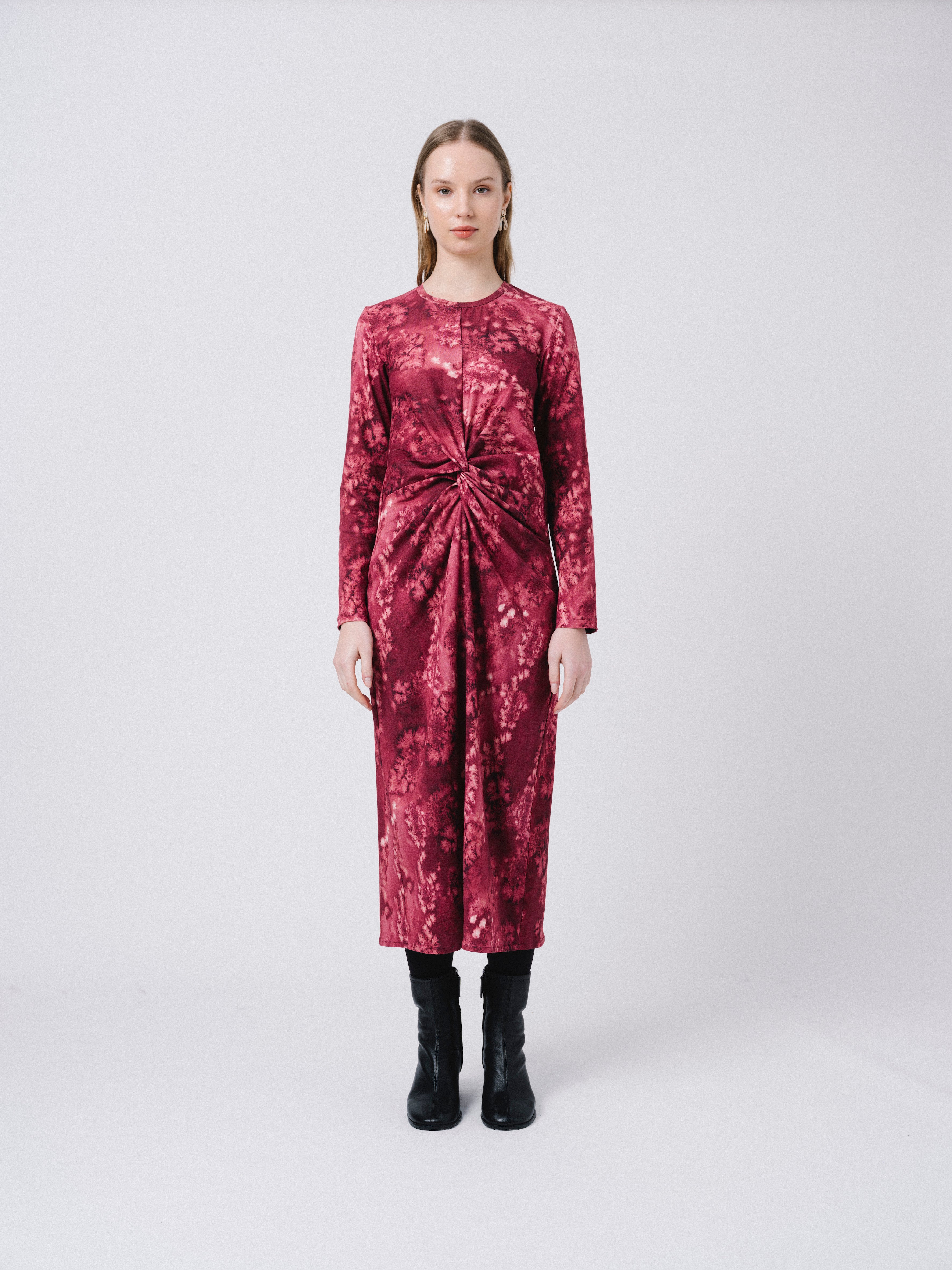 Vestido largo con marga larga. Escote redondo y detalle de nudo en el delantero. Estampado propio diseñado en nuestro estudio.