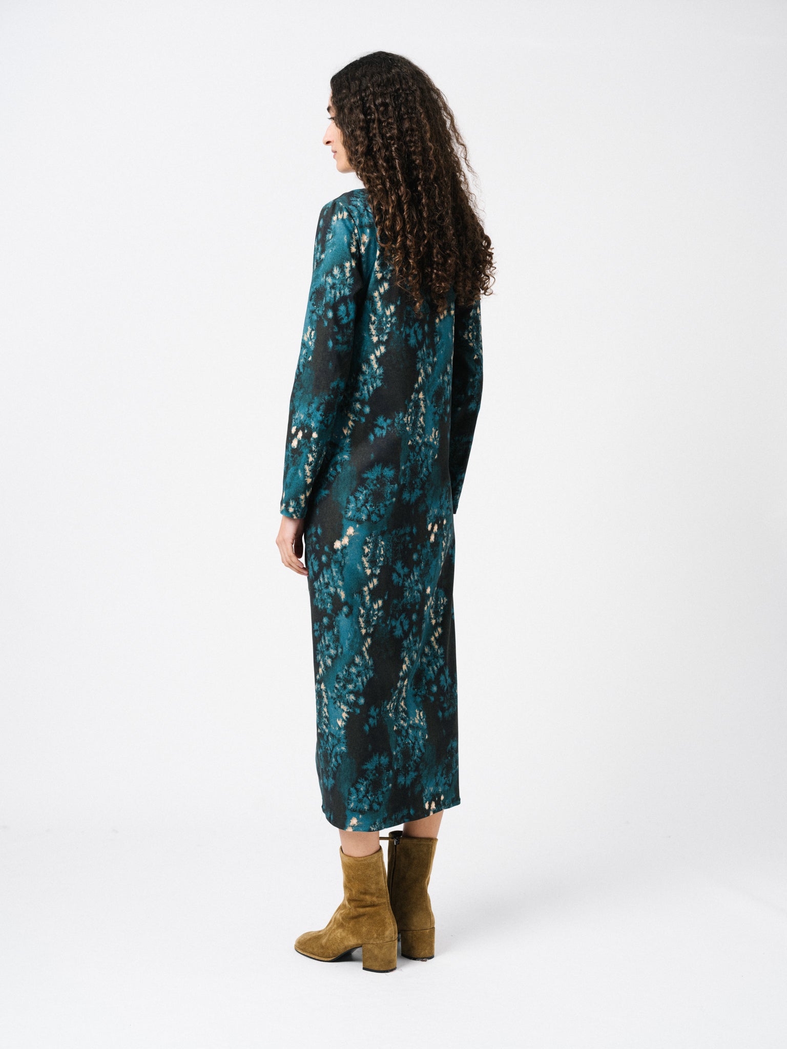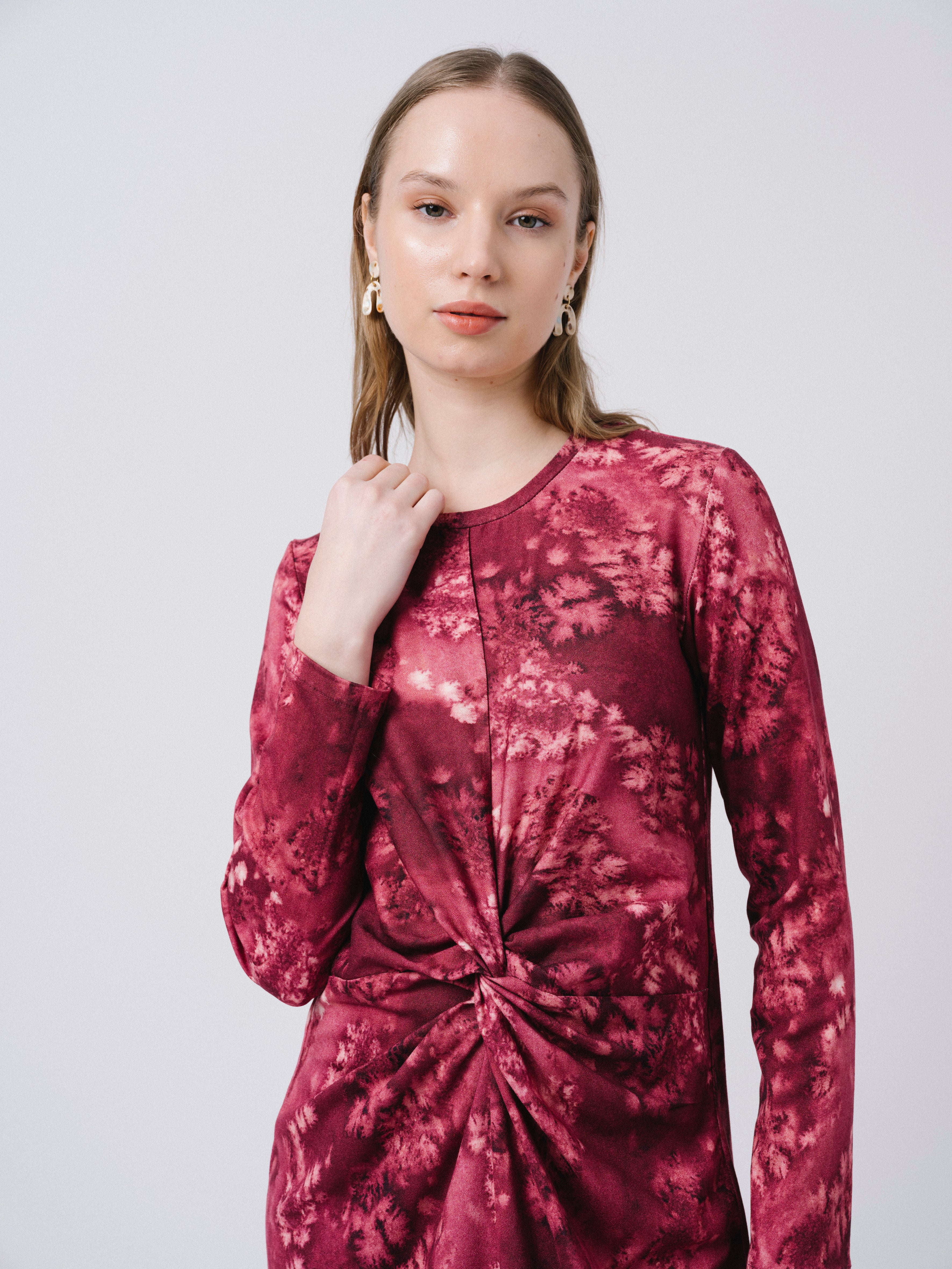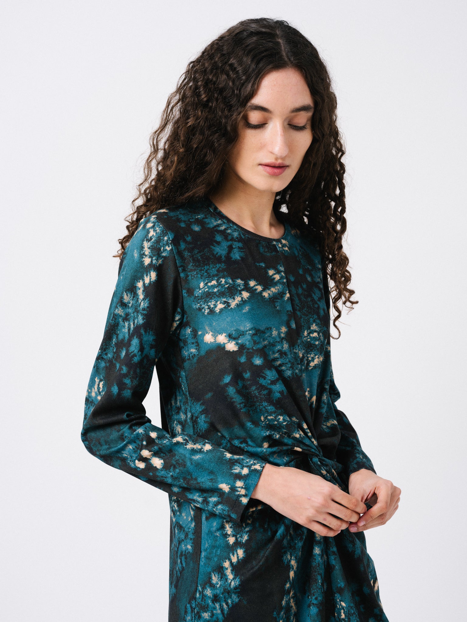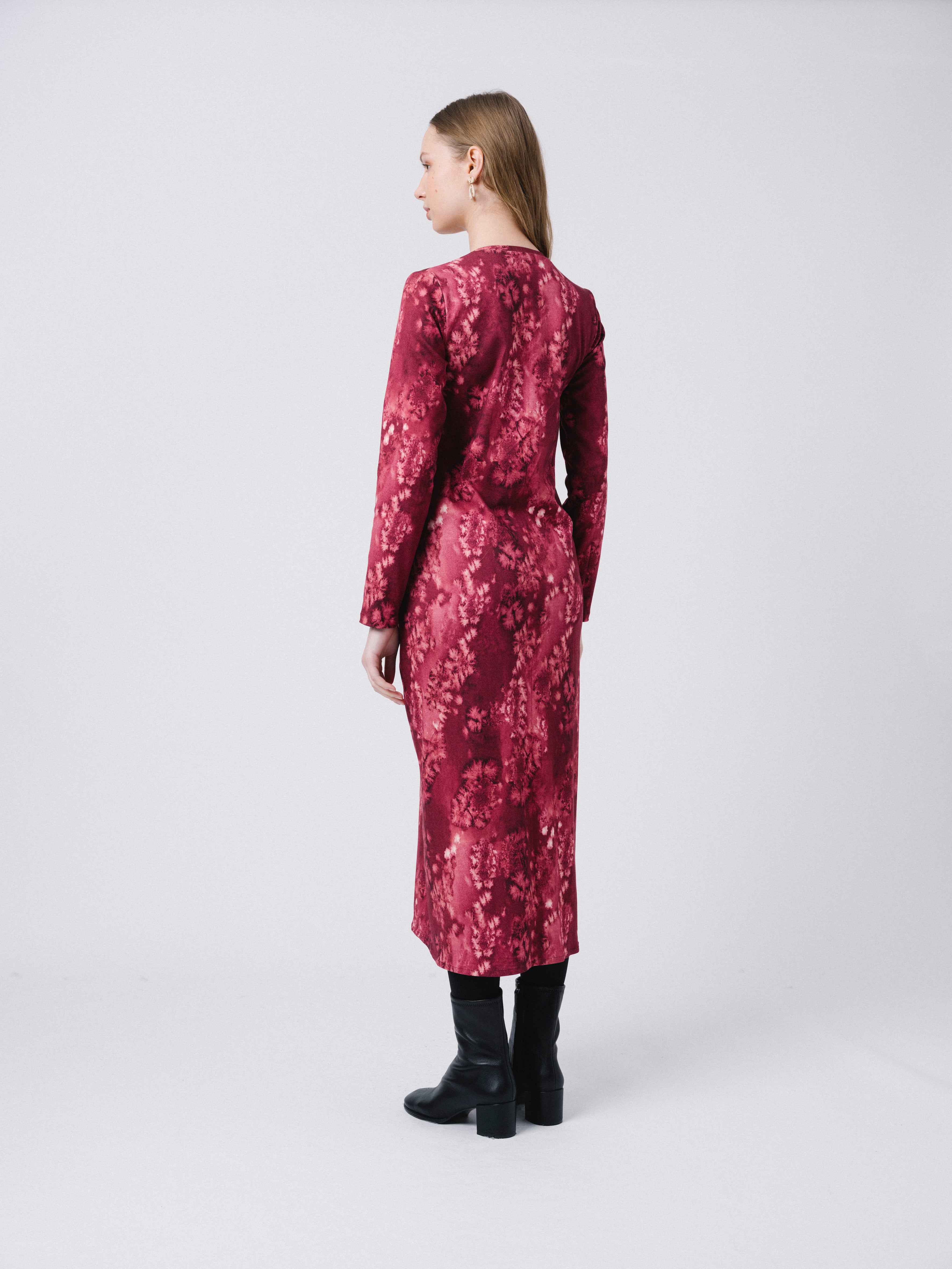Vestido largo con marga larga. Escote redondo y detalle de nudo en el delantero. Estampado propio diseñado en nuestro estudio.